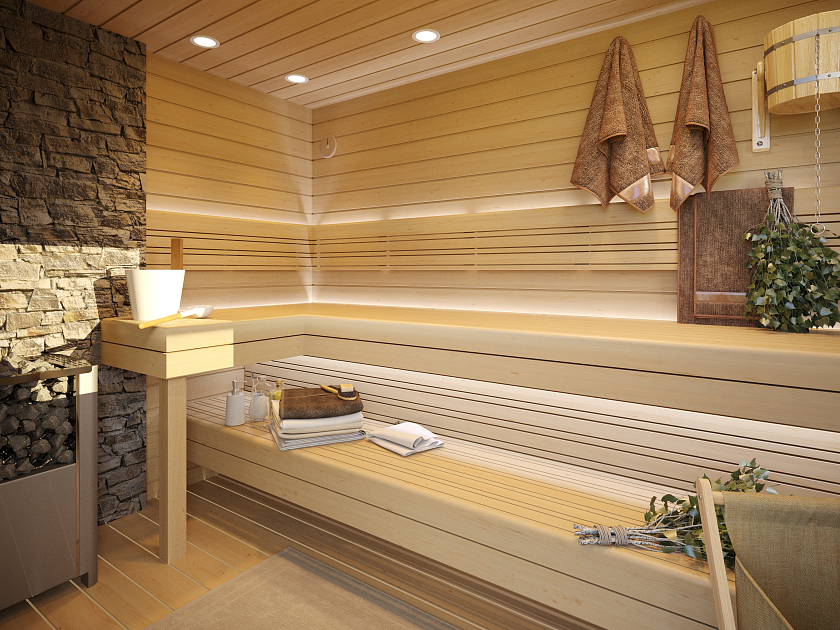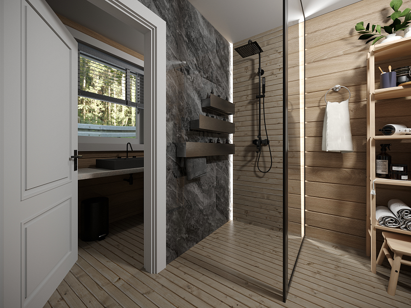 Площадь бани будто разделена на две части. Первая – это зона отдыха: открытая г-образная терраса (27,34 кв.м) и комната отдыха (22,66 кв.м) и вторая, предназначенная для гигиенических процедур, – баня с парной (4,93 кв.м) и моечной (5,66 кв.м). Также по проекту предусмотрен санузел (3,04 кв.м).