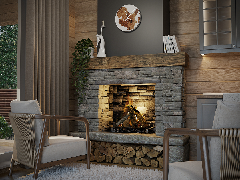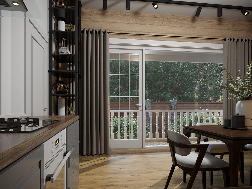 Наличие просторной террасы – пожелание заказчика. Благодаря дизайнерским приемам и двум выходам на террасу получилось создать красивый и модный эффект единого пространства террасы и комнаты отдыха. А за счёт больших окон в пол обеспечена уникальность интерьера и наиболее полное естественное освещение комнаты.