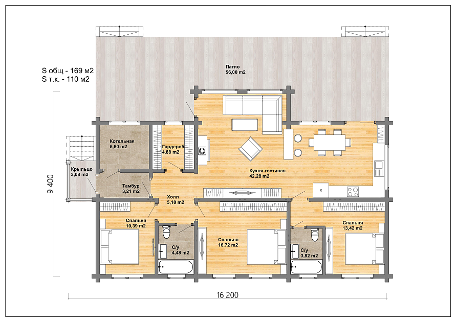 В доме два входа: круглогодичный с крыльца (3,08 кв.м) через тамбур (3,21 кв.м) в холл (5,10 кв.м), второй - летний с патио (56,00 кв.м) в просторную кухню-гостиную (42,28 кв.м).