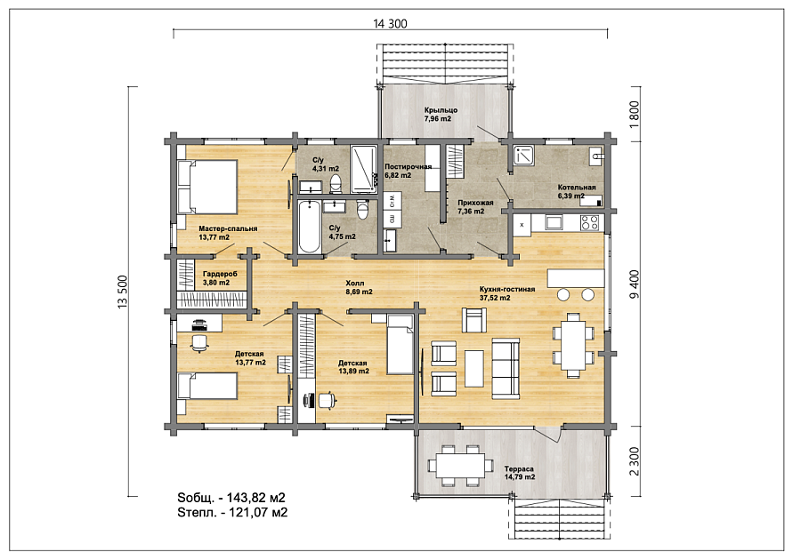 Внешний вид дома сочетает в себе классические ,но в тоже время элегантные формы общей площадью 144 м.кв.. Стены дома выполнены из высококачественных материалов, таких как клееный брус. Неоспоримыми преимуществами которого являются: