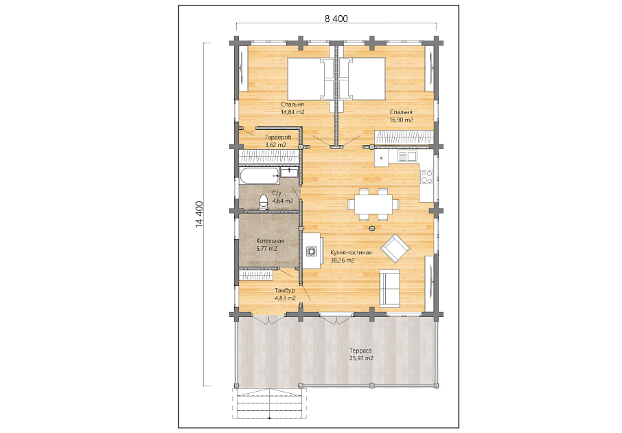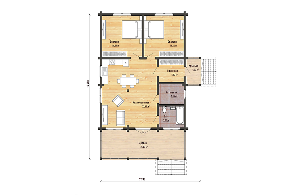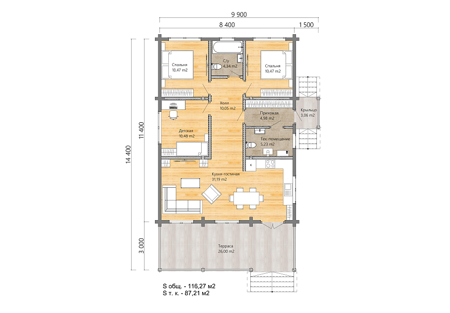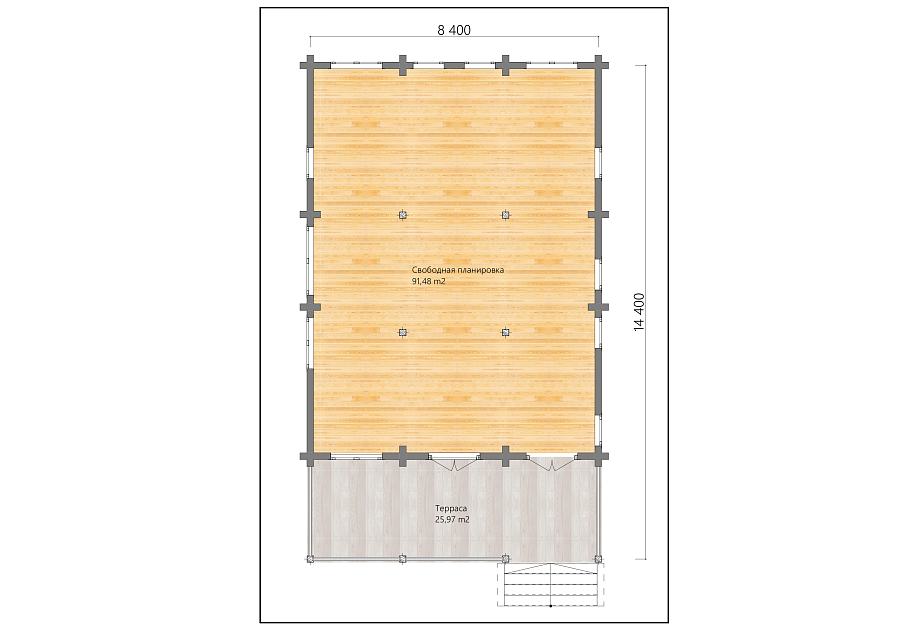 Открытая терраса (25,97 кв.м) функциональна в любое время года. В хорошую тёплую погоду здесь приятно проводить время своей семьей или принимать гостей. В ненастье или холодное время года можно пофантазировать и сделать на террасе, например, игровую площадку или спортивный уголок для детей.