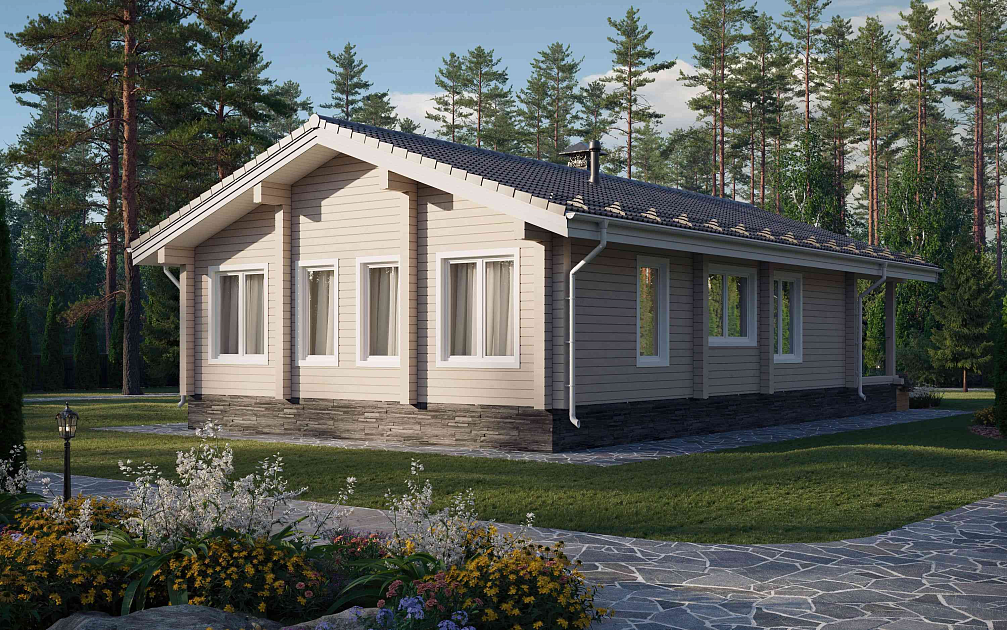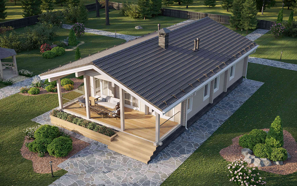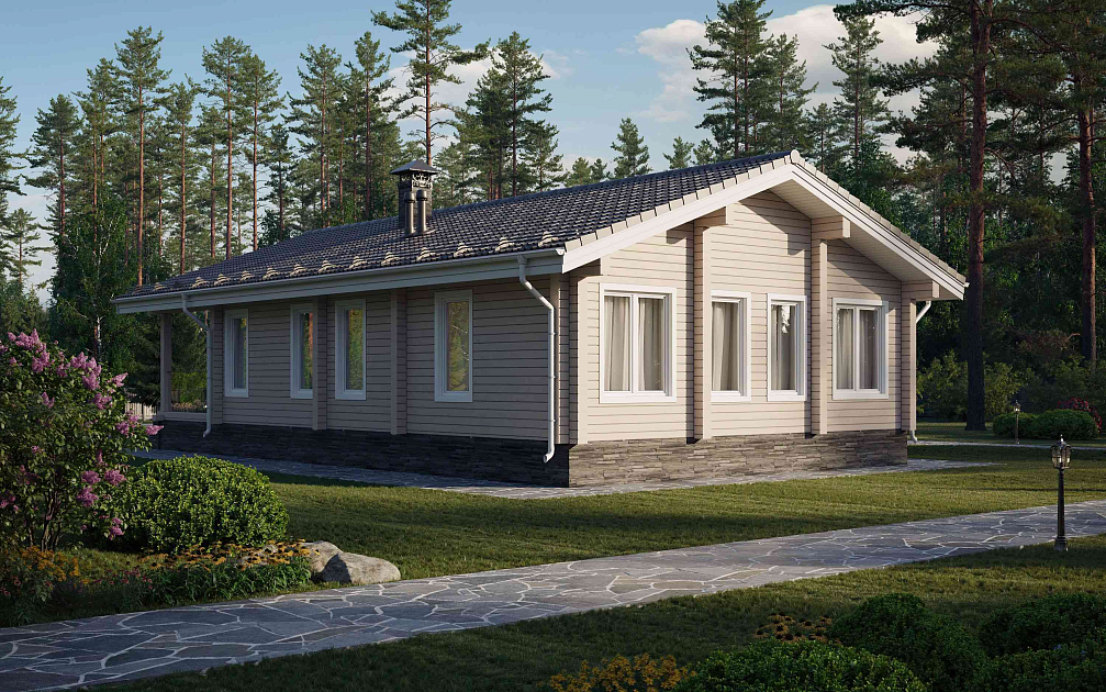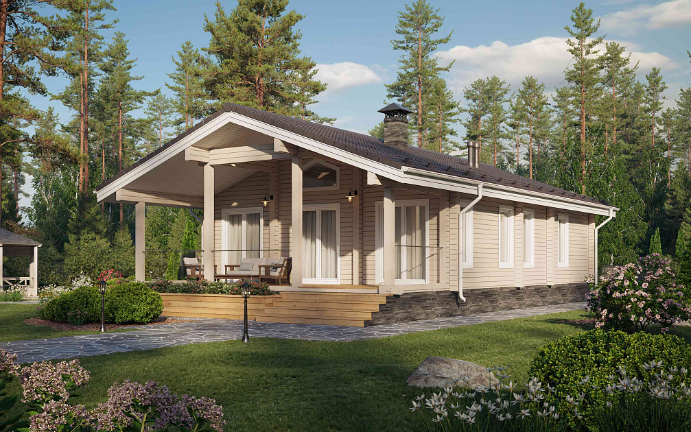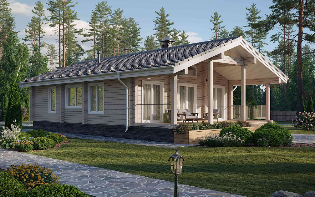 Кажущаяся простота архитектуры дома обманчива. На просторном участке такой дом выглядит эффектно: строгая симметрия в планировке, открытая просторная веранда и двухскатная крыша. Натуральные материалы, идеально подобранные природные цвета дома, крыши и фундамента создают ощущение воздушности и гармонии с окружающим миром.