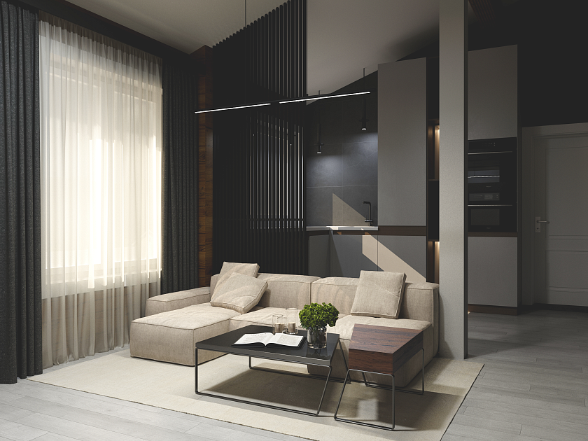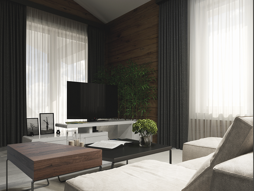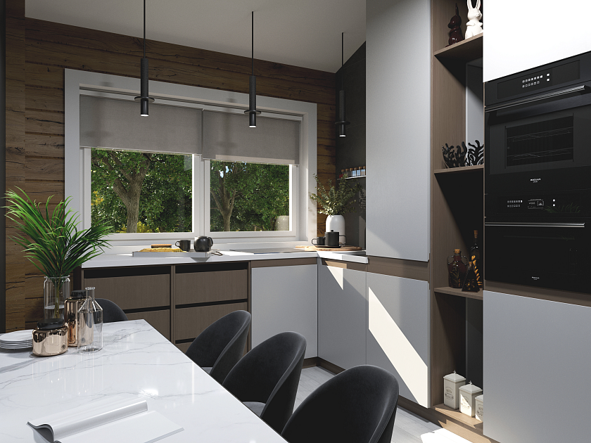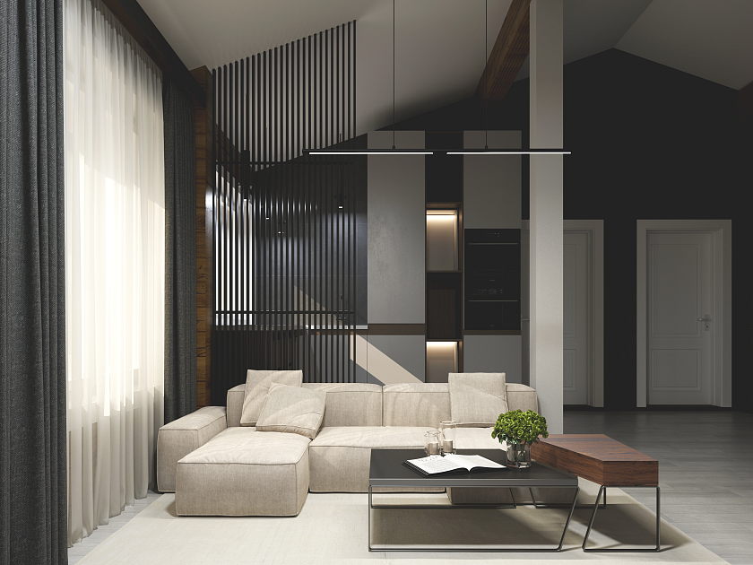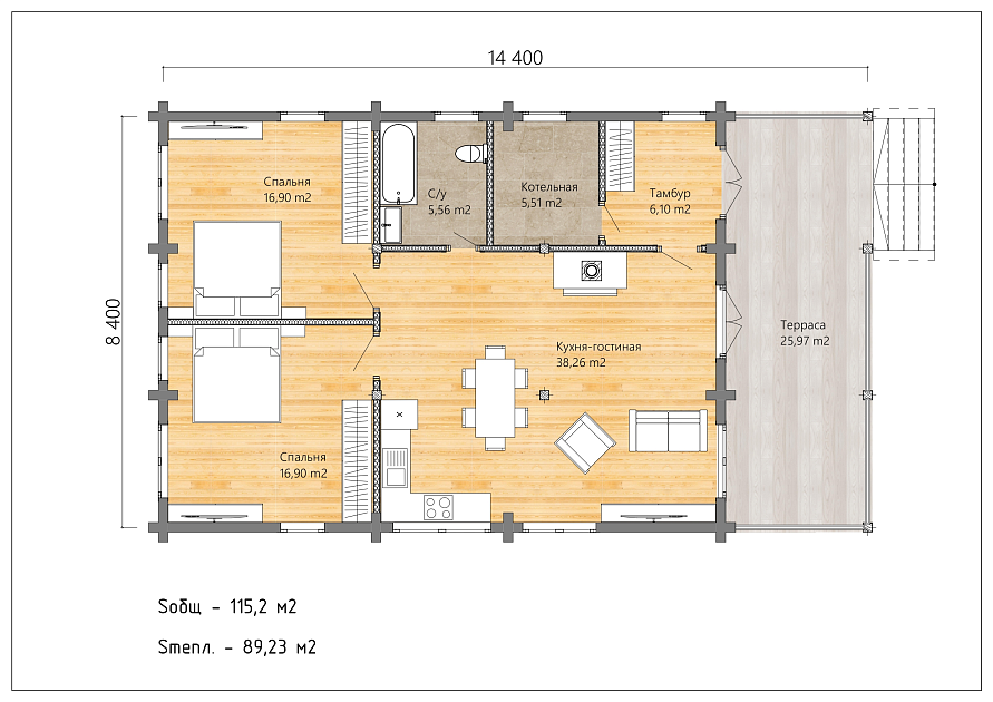 Самое большое помещение в доме – совмещенная кухня-гостиная (38,26 кв.м) имеет свои плюсы. Современные дизайнерские приемы позволят грамотно использовать большую площадь, разделив её на зоны. Можно «поиграть» с мебелью и разместить обеденную зону с большим красивым столом, зону отдыха с просторным диваном и широкоформатным телевизором. При этом кухонная зона займет совсем немного места, но его достаточно для приготовления еды. И, что особенно ценно, при желании вся семья может здесь проводить своё свободное время, дружно участвуя в общих семейных хлопотах. Будь то приготовление каких-то вкусностей или просмотр хорошего фильма.