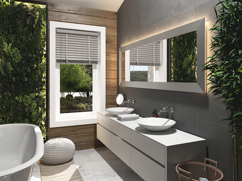 Довольно просторный совмещенный санузел (5,92 кв.м). Благодаря наличию окна эта ванная воспринимается именно как полноценная комната, а не просто замкнутое со всех сторон помещение.