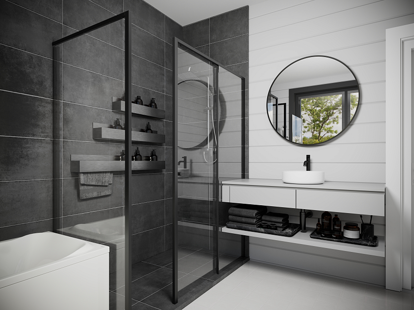 Впечатляет и санузел – просторное помещение с окном. Благодаря светлому интерьеру, функциональной скрытой системе хранения комната смотрится стильно и элегантно.