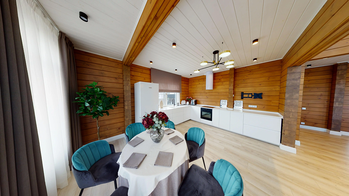 Панорамные окна, второй свет, выход на террасу с гостиной и кухни позволяют полностью прочувствовать преимущества загородной жизни. Большая, наполненная светом гостиная, приглашает к уютным семейным или дружеским посиделкам, а примыкающая терраса служит ей альтернативой в тёплые летние вечера.