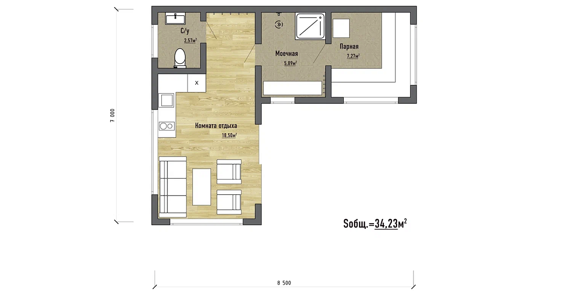 Общая площадь: 34,23 м3 - оптимальный размер для комфортного отдыха.