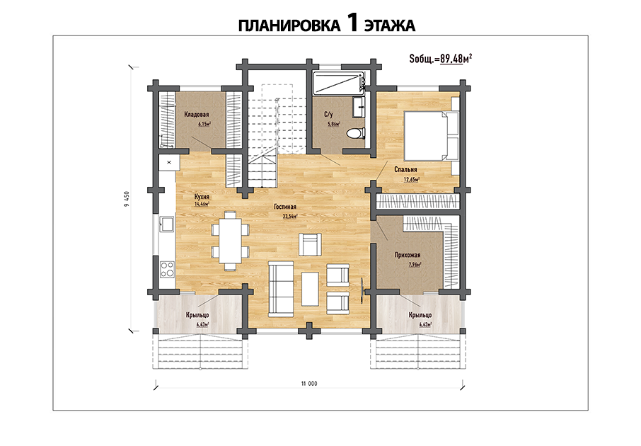 При входе в дом — два крыльца по 4,43 м², с которых вы попадаете в просторную прихожую (7,96 м²) и зону кухни (14,46 м²), ведущую далее в гостиную.
