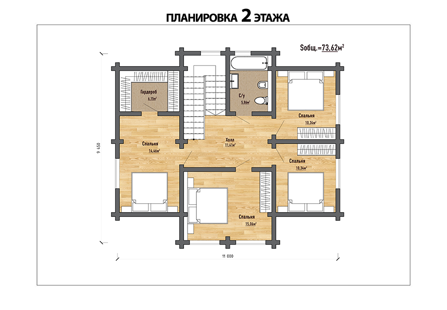 На второй этаж ведёт удобная лестница, переходящая в просторный холл (11,41 м²) — центр, объединяющий все комнаты.