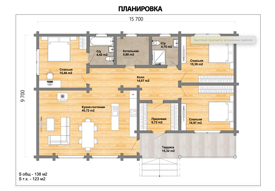 Дом «Бруно»: Уют и простор из клеёного бруса Дом «Бруно» — это воплощение гармонии современного комфорта и теплой эстетики натурального дерева. Построенный из клеёного бруса, он обладает безупречной геометрией, высокой энергоэффективностью и особым, здоровым микроклиматом. Планировка для жизни без компромиссов: · Просторная гостиная-кухня (40.68 м²) — светлое сердце дома, объединяющее семью. Прямой выход на большую террасу стирает грань между внутренним уютом и природой за окном. · Две равнозначные спальни (15.34 м² и 15.24 м²) — гарантия личного пространства и комфортного отдыха для всех. · Настоящая баня в доме: компактная парная (4.90 м²) и просторная помывочная (11.68 м²) — ваша собственная зона релаксации в любое время года. · Практичная инфраструктура: удобный санузел (5.34 м²), функциональная прихожая (6.72 м²) и отдельная котельная (5.79 м²). Ключевые особенности: · Большая терраса (22.98 м²) — идеальное место для завтраков на свежем воздухе, летних ужинов и созерцания вечерних закатов. · Клеёный брус — материал, который не дает усадки, не трескается и обладает превосходной теплоизоляцией. · Продуманная одноэтажная планировка — безопасность и удобство для жизни в любом возрасте.