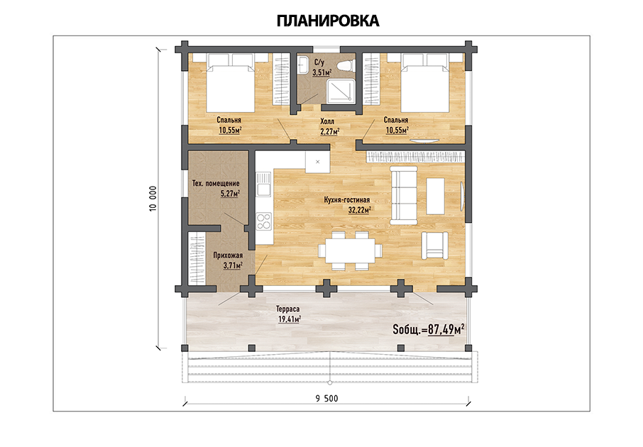 Проект «Орфей» — это гармоничное сочетание современной планировки, экологичности натуральной древесины и особого уюта. Компактный и продуманный до мелочей, он предлагает всё необходимое для комфортной жизни семьи. Ключевые характеристики: · Общая площадь дома: 87,49 м² · Материал: Клееный брус (прочность, низкая усадка, эстетика) · Дополнительная площадь: Просторная терраса 19,41 м² · Особенность: Удобный вход через террасу Планировочные решения: 1. Территория отдыха — Терраса (19,41 м²) Дом начинается с большого крыльца-террасы. Это ваша летняя гостиная, место для завтраков на свежем воздухе, вечерних посиделок с друзьями и единения с природой. Отсюда вы попадаете прямо в сердце дома. 2. Сердце дома — Кухня-гостиная (32,22 м²) Просторное светлое помещение, объединяющее кухонную зону и зону отдыха. Большая площадь остекления от террасы наполняет пространство светом и создает эффект единения с внешним миром. 3. Зона уединения — Спальни (2 x 10,56 м²) Две изолированные спальни равной площади обеспечивают комфортное личное пространство для родителей и ребенка. Достаточный размер для всей необходимой мебели. 4. Технический блок и санузел · Техническое помещение (5,27 м²): Удобное пространство для размещения котельного оборудования, систем вентиляции или использования под кладовую. · Санузел (3,51 м²): Компактный и функциональный, оборудован всем необходимым. Преимущества проекта: · Практичная планировка: Четкое зонирование на дневную (кухня-гостиная-терраса) и ночную (спальни) зоны. · Экологичность и здоровый микроклимат: Клееный брус создает идеальный баланс влажности и температуры. · Энергоэффективность: Высокие теплоизоляционные свойства бруса делают дом теплым зимой и прохладным летом, экономя ваши средства. · Быстрые сроки возведения: Конструкция из клееного бруса монтируется в сжатые сроки с высокой точностью. · Готовая эстетика: Стены из бруса не требуют сложной внутренней отделки — это уже красиво и стильно. Идеально для: Молодой семьи, пары, ищущей уютный дом для постоянного проживания или в качестве комфортной дачи.