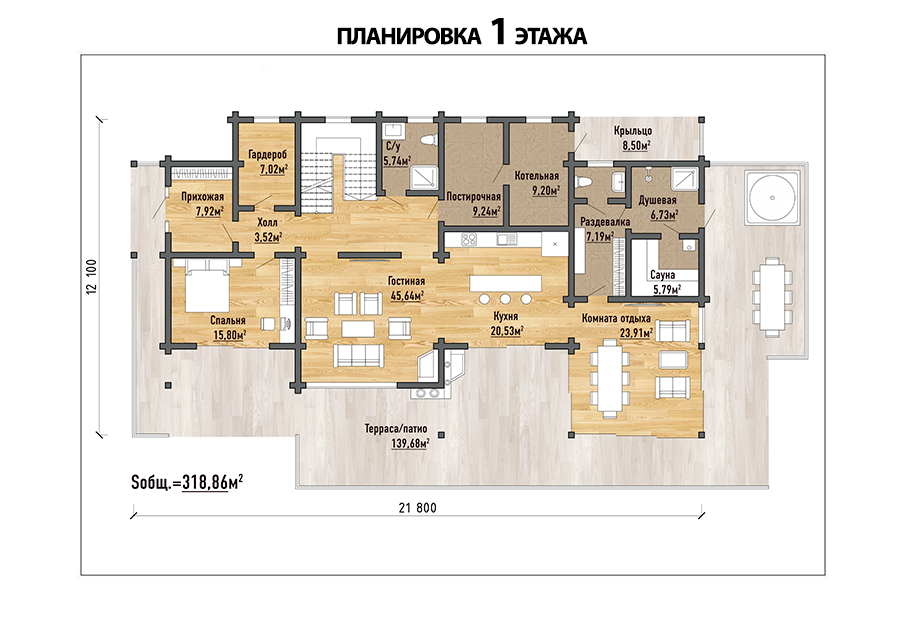 Дом «Велес» — это гармоничный диалог традиционной надежности и современной эстетики. Проект, в котором мощь и экологичность клееного бруса встречаются с четкими линиями плоской кровли, создавая стильное и невероятно комфортное пространство для жизни вашей семьи. Ключевые особенности: · Материал: Премиальный клееный брус — гарантия идеального микроклимата, прочности и безупречной экологии. · Архитектура: Два этажа с плоской кровлей в современном стиле. · Простор: Общая площадь дома — 318,86 м², дополненная уютным патио 139,68 м² для отдыха на открытом воздухе. · Участок застройки: Удобный прямоугольник 21,8 x 12,1 м. Планировочные решения: продуманный до мелочей комфорт Первый этаж — пространство для жизни и отдыха Здесь каждая зона служит для гармонии и расслабления. · Гостиная с «вторым светом»: Сердце дома площадью 45,64 м². Пространство, залитое светом и воздухом, где собирается вся семья. · Кухня (20,53 м²): Современное и эргономичное помещение для приготовления пищи и неформальных встреч. · Гостевая спальня (15,80 м²): Уютная комната с выходом на террасу — идеально для гостей или старших членов семьи. · Комплекс для релаксации: Персональная сауна с просторной комнатой отдыха и санузлом — ваш частый SPA-уголок в любое время года. · Технические помещения: Удобная постирочная, котельная и гардеробная вынесены в отдельную зону. Второй этаж — приватная территория семьи · Мастер-спальня (16,54 м²): Настоящее родительское убежище с собственным балконом, гардеробной и санузлом. · Детские спальни (15,80 м² и 19,45 м²): Просторные, светлые комнаты для детей, с возможностью легко адаптировать пространство под растущие потребности. · Отдельная ванная комната (12,01 м²): Достаточная для комфорта всех обитателей второго этажа. Дом «Велес» — это не просто квадратные метры. Это современная, надежная и невероятно уютная среда, где каждый день будет наполнен гармонией и радостью.