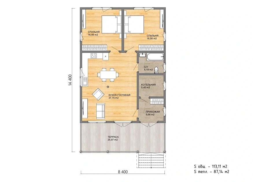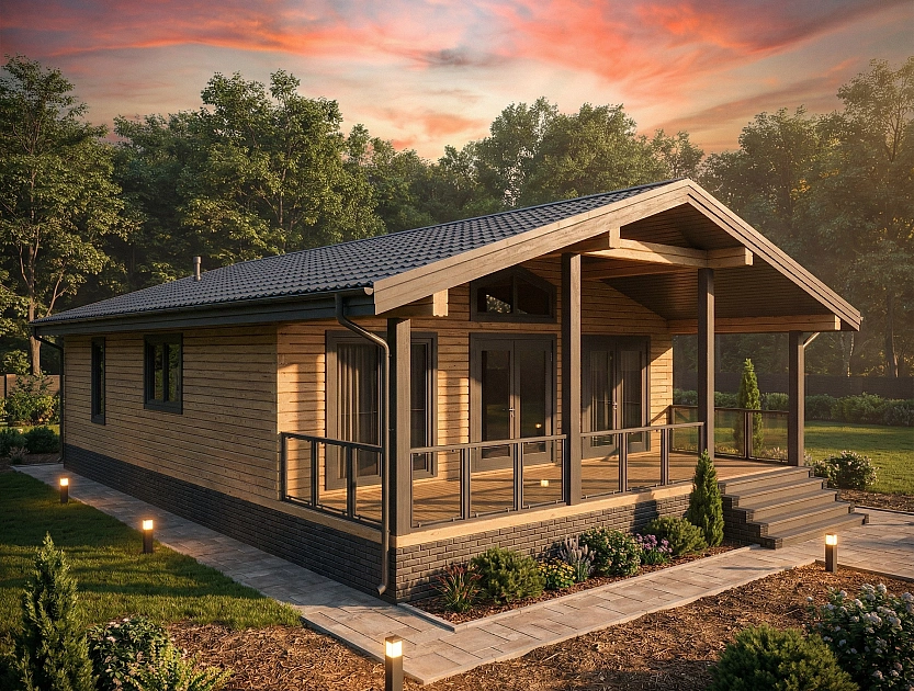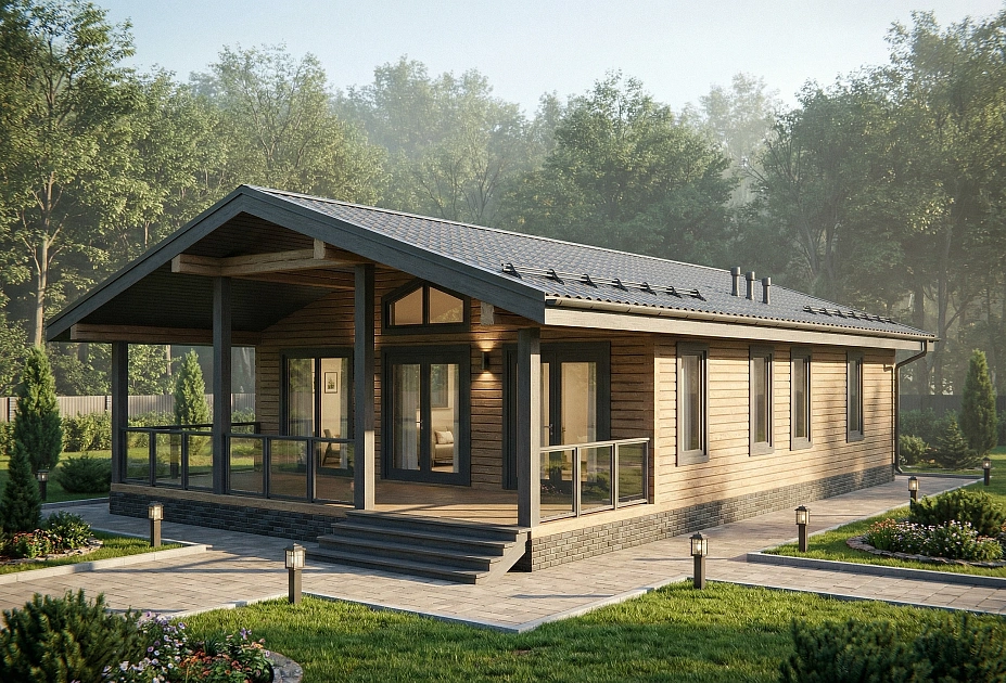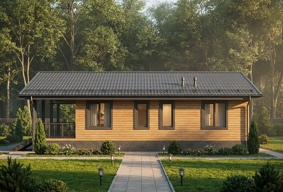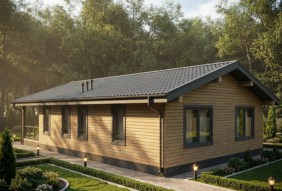 «Ника» — компактный и продуманный одноэтажный дом из бруса для пары или небольшой семьи, которой важно пространство без лишних метров. Главное в этом проекте — огромная кухня-гостиная почти в 38 м² и терраса на 26 м²: вместе они создают открытую зону, где хочется проводить большую часть времени — от завтрака до позднего вечера с гостями. Два равнозначных спальных крыла по обе стороны от общей зоны дают каждому своё тихое пространство, не нарушая ощущения цельного дома. Помещения Кухня-гостиная (37,75 м²) — самое большое помещение дома и его смысловой центр. Здесь свободно размещается полноценный обеденный стол на 6–8 человек, гостиная зона и рабочая кухня — и при этом остаётся пространство для воздуха. Терраса (25,97 м²) — широкая открытая площадка вдоль всего фасада. Летом это полноценная вторая гостиная: место для обеда на свежем воздухе, вечерних разговоров и утреннего кофе с видом на участок. Спальня 1 (16,56 м²) — расположена в левом крыле, имеет встроенный шкаф. Изолирована от входной зоны, тихая. Спальня 2 (16,56 м²) — зеркальная по площади и планировке, в правом крыле. Рядом — санузел с ванной, что делает её удобной родительской спальней. Санузел (5,19 м²) — с ванной, расположен между правой спальней и общей зоной. Один санузел на 2–3 человека — оптимальное решение для этого формата. Прихожая (5,68 м²) — отдельный вход, место для верхней одежды и обуви. Не проходной коридор, а полноценная буферная зона между улицей и домом. Котельная (5,40 м²) — вынесена в отдельное помещение рядом с входом, не занимает жилое пространство. Стоимость и комплектации проекта «Ника» Проект «Ника» доступен в нескольких комплектациях — от домокомплекта до дома под ключ. Стоимость зависит от выбранной комплектации, состава инженерных систем и удалённости участка от Москвы. Рассчитать стоимость под ваш участок можно в течение одного рабочего дня — оставьте заявку или позвоните нам напрямую.