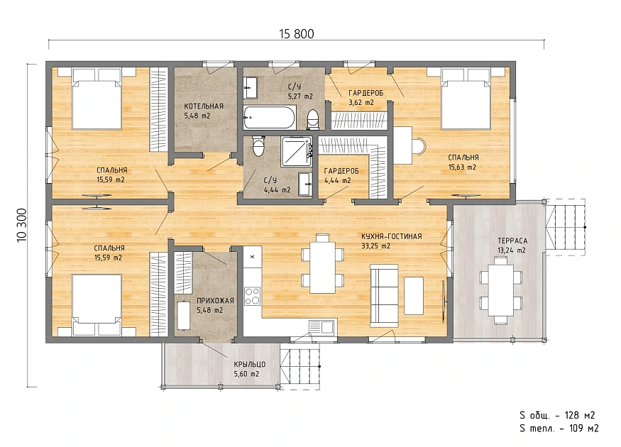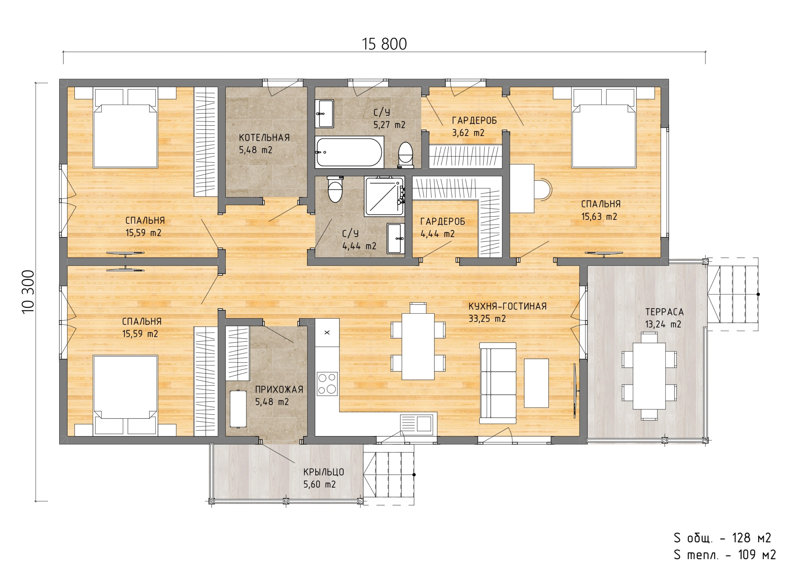 Три равнозначные спальни, два санузла, два гардероба и большая кухня-гостиная с выходом на террасу — здесь продумано всё, чтобы близкие не мешали друг другу и при этом всегда были рядом.