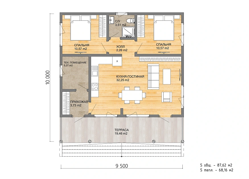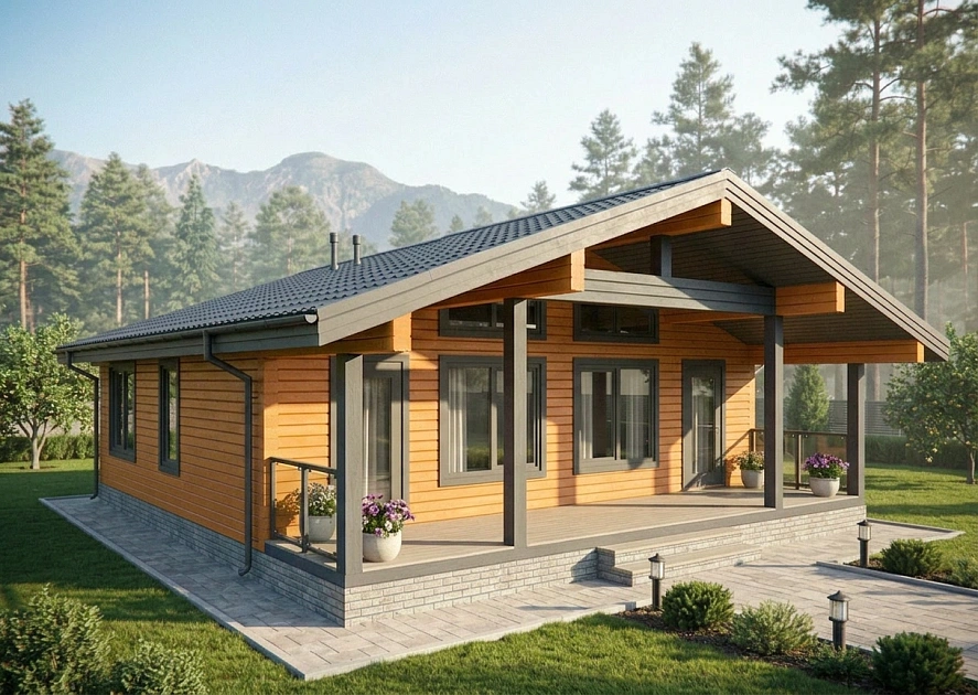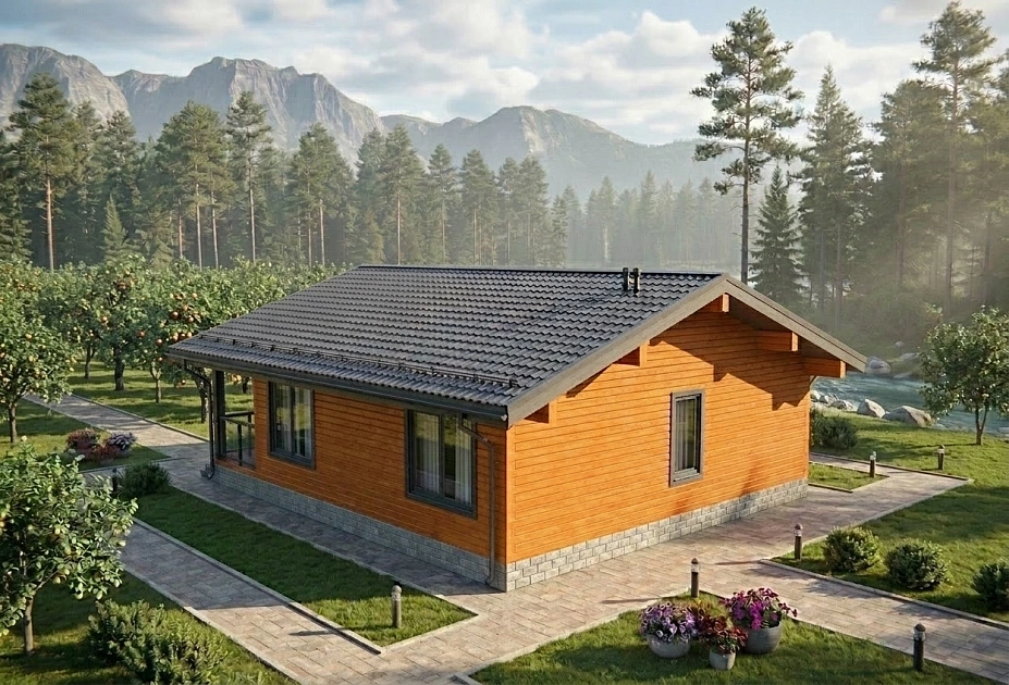 Почти половину тёплой площади занимает кухня-гостиная без лишних перегородок. К ней примыкает терраса на всю ширину дома: 19 м², с которых открывается вид на участок. Две спальни в глубине — тихие, изолированные от общей зоны. Всё остальное убрано: нет длинных коридоров, проходных комнат, тёмных углов.