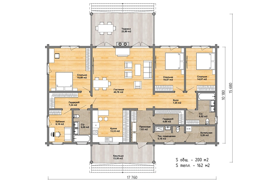 Гениальная планировка: всё под рукой, ничего лишнего «Сириус 2.0» предлагает безупречное зонирование, где нет места пустым коридорам, а есть только полезные метры. * Сердце дома — гостиная-кухня (40,78 м² + 13,33 м²): Просторная светлая гостиная плавно перетекает в эргономичную кухню-столовую. Панорамный выход на террасу превращая обед в зоне барбекю или ужин на свежем воздухе в ежедневный ритуал. * Мастер-люкс нового поколения (суммарно 41,4 м²): Это не просто спальня, а персональная квартира внутри дома. Просторная спальня (19,89 м²), изолированный кабинет для работы (8,18 м²), полноценная гардеробная (7,24 м²) и приватный санузел (6,08 м²) создают идеальное пространство для родителей. * Гостевая/детская зона: Две равнозначные, светлые спальни (по 14,07 м²) — отличное решение для детей или для приема гостей. Их обслуживает просторный отдельный санузел (8,02 м²), что обеспечивает автономность и комфорт для всех. * Технический блок: Все коммуникации и системы аккуратно собраны в компактных, специально выделенных помещениях (техпомещение 5,18 м² и котельная 5,28 м²). Это безопасность, удобство обслуживания и тишина в жилых комнатах. «Сириус 2.0» — это следующий шаг. Это дом, который уже полюбили, но сделали еще лучше. Для жизни, которая целиком и полностью — на одном, комфортном, уровне.