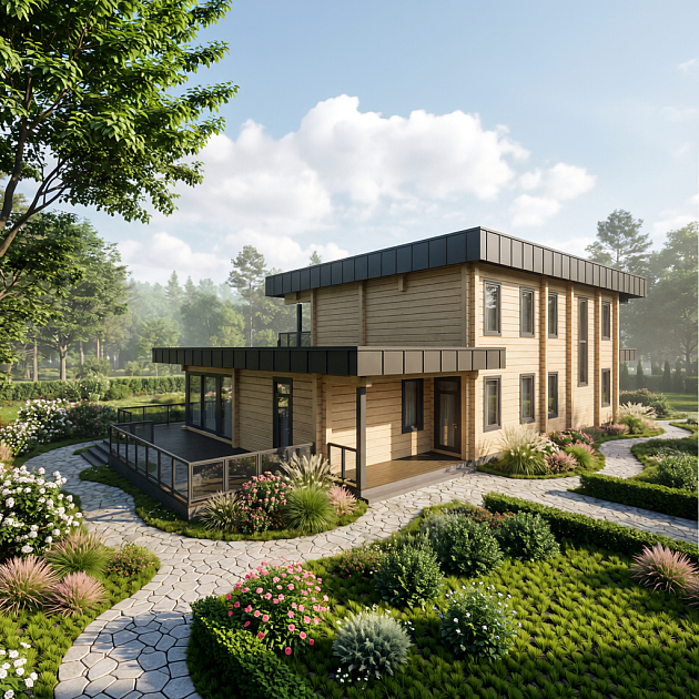 Дом «Велес» — это гармоничный диалог традиционной надежности и современной эстетики. Проект, в котором мощь и экологичность клееного бруса встречаются с четкими линиями плоской кровли, создавая стильное и невероятно комфортное пространство для жизни вашей семьи. Ключевые особенности: · Материал: Премиальный клееный брус — гарантия идеального микроклимата, прочности и безупречной экологии. · Архитектура: Два этажа с плоской кровлей в современном стиле. · Простор: Общая площадь дома — 318,86 м², дополненная уютным патио 139,68 м² для отдыха на открытом воздухе. · Участок застройки: Удобный прямоугольник 21,8 x 12,1 м. Планировочные решения: продуманный до мелочей комфорт Первый этаж — пространство для жизни и отдыха Здесь каждая зона служит для гармонии и расслабления. · Гостиная с «вторым светом»: Сердце дома площадью 45,64 м². Пространство, залитое светом и воздухом, где собирается вся семья. · Кухня (20,53 м²): Современное и эргономичное помещение для приготовления пищи и неформальных встреч. · Гостевая спальня (15,80 м²): Уютная комната с выходом на террасу — идеально для гостей или старших членов семьи. · Комплекс для релаксации: Персональная сауна с просторной комнатой отдыха и санузлом — ваш частый SPA-уголок в любое время года. · Технические помещения: Удобная постирочная, котельная и гардеробная вынесены в отдельную зону. Второй этаж — приватная территория семьи · Мастер-спальня (16,54 м²): Настоящее родительское убежище с собственным балконом, гардеробной и санузлом. · Детские спальни (15,80 м² и 19,45 м²): Просторные, светлые комнаты для детей, с возможностью легко адаптировать пространство под растущие потребности. · Отдельная ванная комната (12,01 м²): Достаточная для комфорта всех обитателей второго этажа. Дом «Велес» — это не просто квадратные метры. Это современная, надежная и невероятно уютная среда, где каждый день будет наполнен гармонией и радостью.