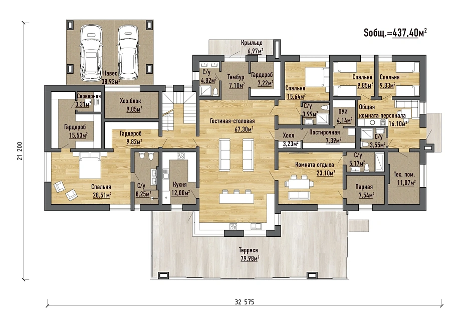 · Конструктив: Основной материал стен — керамический кирпич. Планировочные решения: На первом этаже (437,4 м²) организованы все ключевые зоны: · Просторная гостиная-столовая (67,3 м²) — сердце дома для приёма гостей и семейного отдыха. · Комфортабельный спальный блок: Мастер-спальня (28,51 м²) с двумя гардеробными (9,82 м² и 15,53 м²). · Роскошная зона релаксации: Компактная парная (7,54 м²) с собственной комнатой отдыха (23,1 м²). · Удобная хозяйственная зона: Постирочная (7,39 м²) и кладовая для инвентаря (4,14 м²). · Изолированный блок для персонала с комнатой отдыха (16,1 м²) и двумя спальнями (по 9,8 м²). · Внешние объекты: Терраса (80 м²) для отдыха на свежем воздухе и удобный навес для автомобилей (38,93 м²). Второй этаж (57,47 м²) — приватная зона: · Второй уровень отведён под уединённую спальню (30,06 м²), совмещённую с гардеробом (5,8 м²) и собственным санузлом (5,39 м²). · Балкон (10,44 м²) с выходом из спальни станет любимым местом для утреннего кофе. Уникальная опция — эксплуатируемая кровля: · Плоская крыша превращена в дополнительную полезную площадь 87,79 м². Это идеальное место для обустройства зоны отдыха, солярия или озеленённой террасы с панорамным видом. Технические характеристики: · Общая площадь дома: 583,00 м² · Общая площадь 1 этажа: 437,40 м² · Площадь 2 этажа: 57,47 м² · Эксплуатируемая кровля: 87,79 м² · Терраса: 79,98 м² · Навес для автомобилей: 38,93 м² Проект «Кларк» — это продуманное до мелочей пространство для жизни, где каждая зона служит комфорту и эстетике. Он идеально подходит для большой семьи, ценящей современный дизайн, уединение и возможность принимать гостей с размахом.