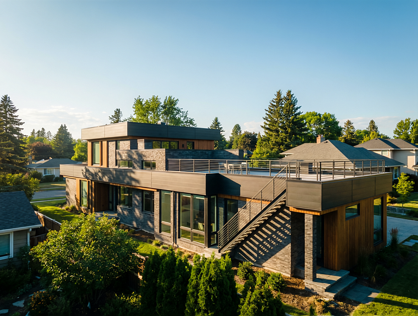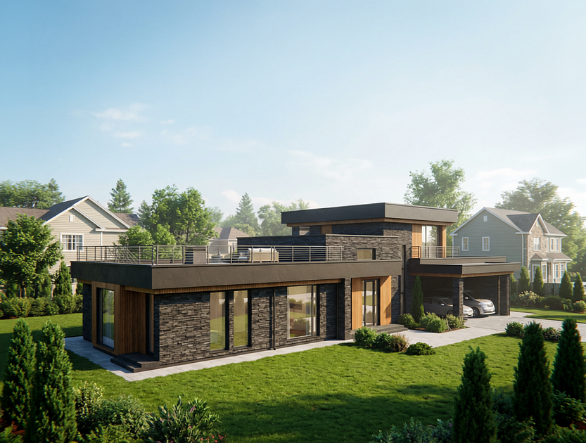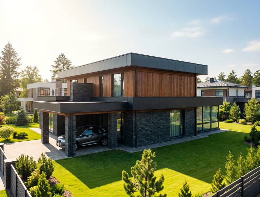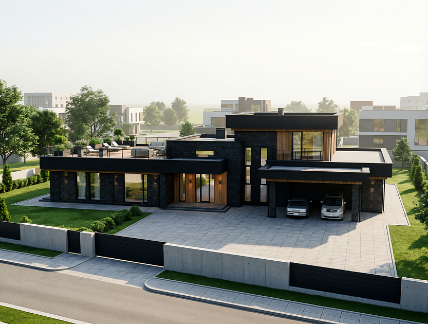 Проект дома «Кларк» — 583 м² Этот проект— воплощение современной архитектуры, где технологичность хай-тека встречается с тёплой текстурой натуральных материалов. Дом из долговечного керамического кирпича с масштабным остеклением. Чёткие линии, функциональная планировка и внимание к деталям создают идеальную среду для требовательного к комфорту владельца. Архитектурные особенности: · Стиль: Чистый, динамичный хай-тек. · Фасад: Смелая комбинация фактур. Надёжный облицовочный кирпич контрастирует с тёплой, обработанной доской. · Концепция: Главный архитектурный приём — большие панорамные окна.