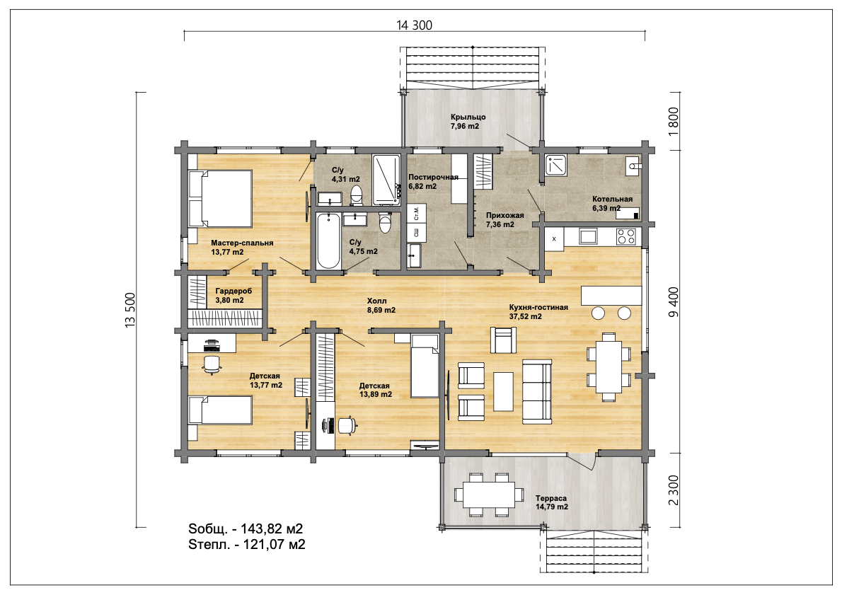 Внешний вид дома сочетает в себе классические ,но в тоже время элегантные формы общей площадью 144 м.кв.. Стены дома выполнены из высококачественных материалов, таких как клееный брус. Неоспоримыми преимуществами которого являются:
