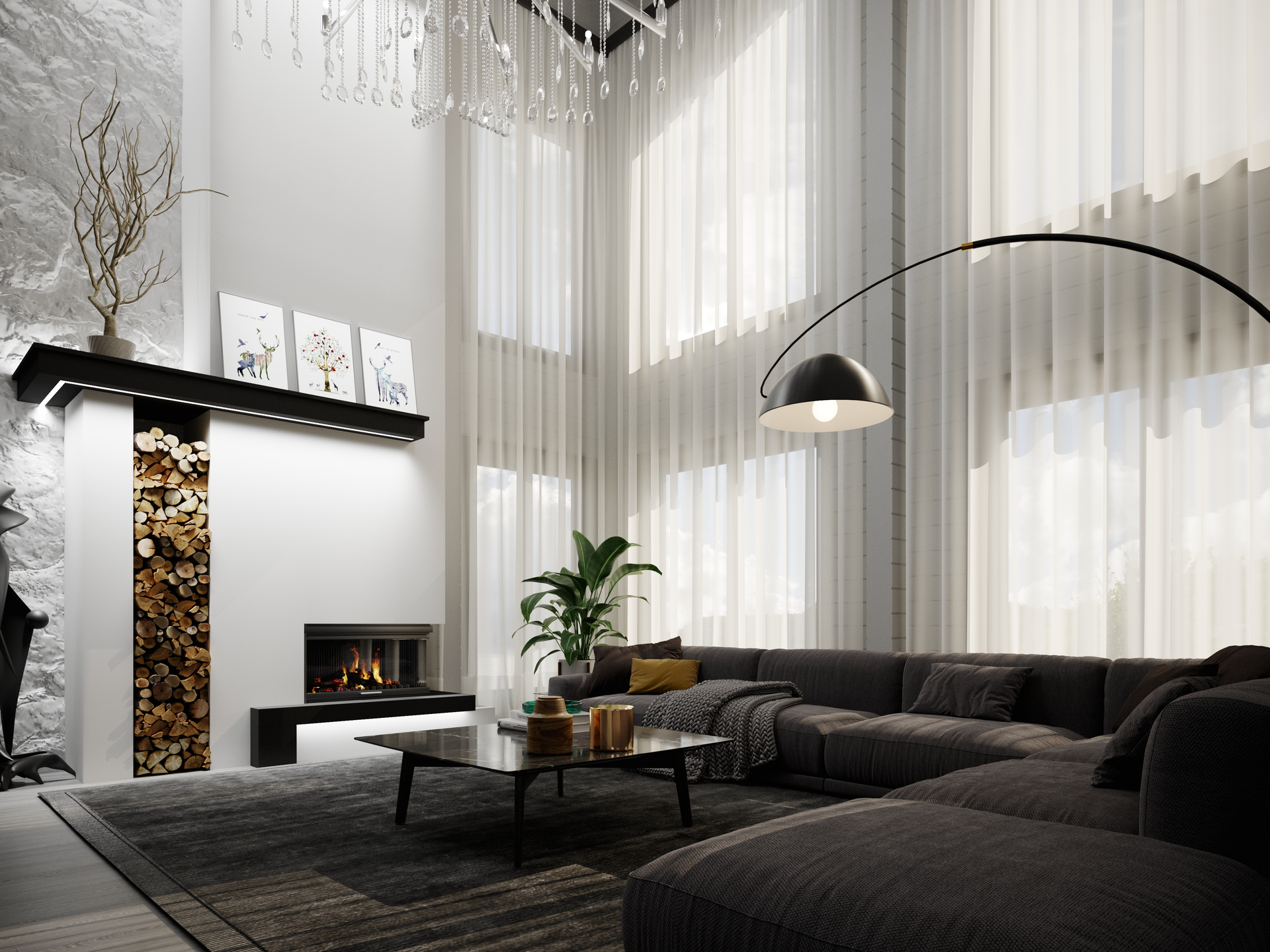 Огромная гостиная – место проведения праздников и приема гостей. Это нарядное и светлое помещение за счет большого количества широких окон и правильно подобранного освещения (прямого, рассеянного и непрямого). Что позволяет создать в гостиной праздничное и феерическое настроение или камерную обстановку.