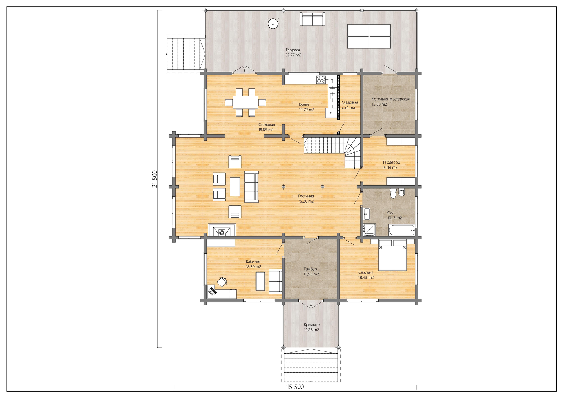 Дом имеет два входа: с главного фасада через террасу (52,77 кв.м) и с бокового фасада через просторное крыльцо (10,28 кв.м).