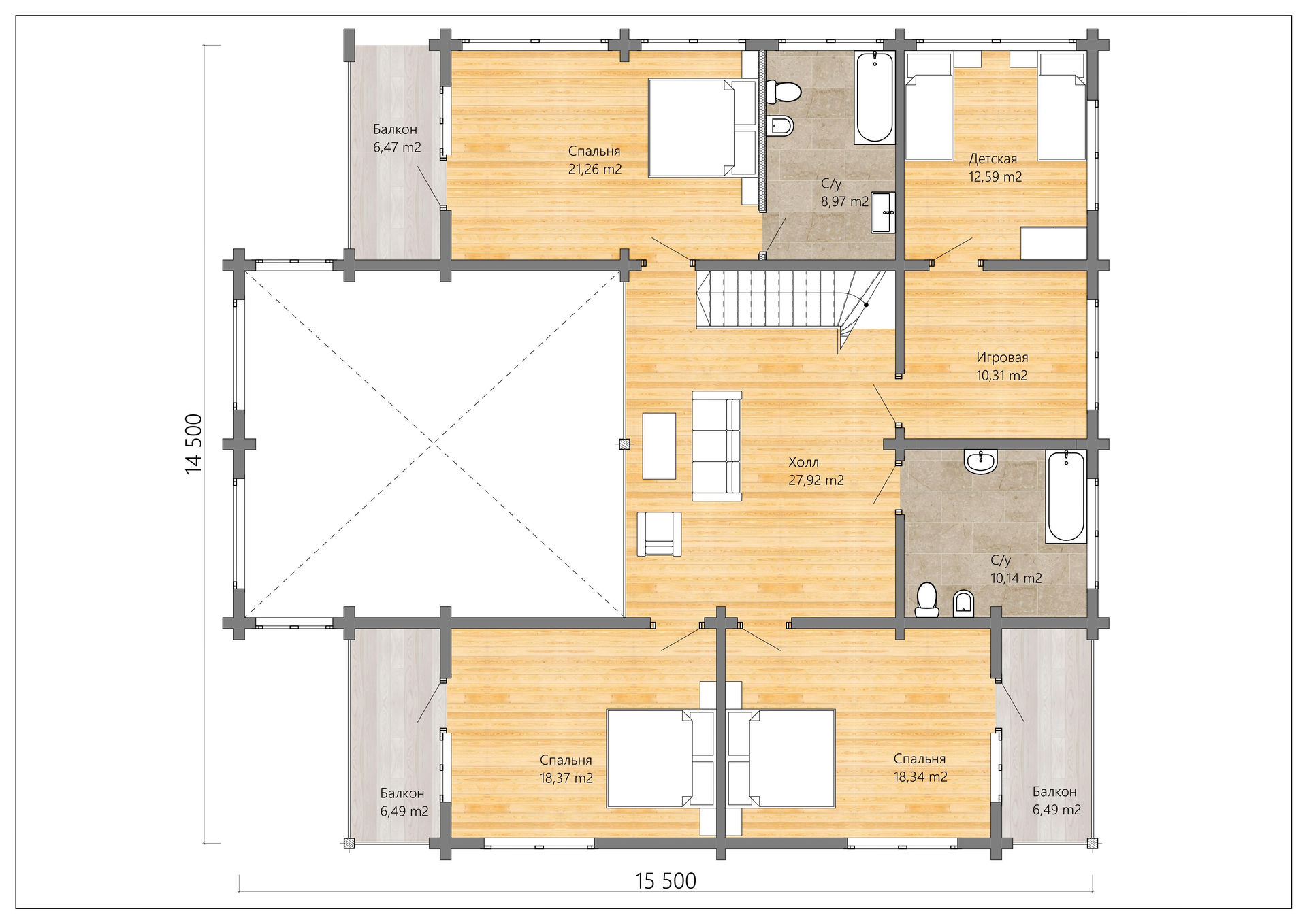 жилая: хозяйская мастер-спальня (21,26 кв.м) с выходом на балкон (6,47 кв.м) и собственным санузлом (8,97 кв.м), детская (12,59 кв.м) совмещена с игровой комнатой (10,321 кв.м), две одинаковые спальни (по 18,37 кв.м)