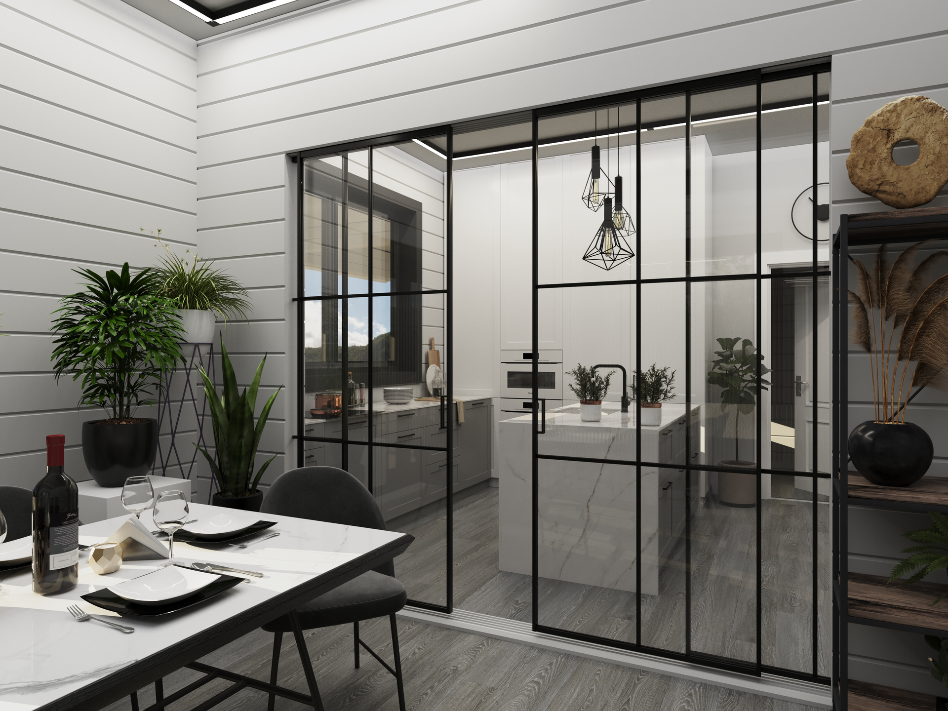 Столовая – востребованное и любимое место у всей семьи. В будни здесь всем уютно и комфортно. Можно присматривать за ребенком, который занят своими делами, из кухни, которая рядом. Кладовую для посуды, продуктов и припасов могут себе позволить немногие. В этом доме рядом с кухней есть комната, оборудованная стеллажами и системой хранения продуктов. Отдельная кладовая разгружает кухню, делает ее свободнее и светлее.