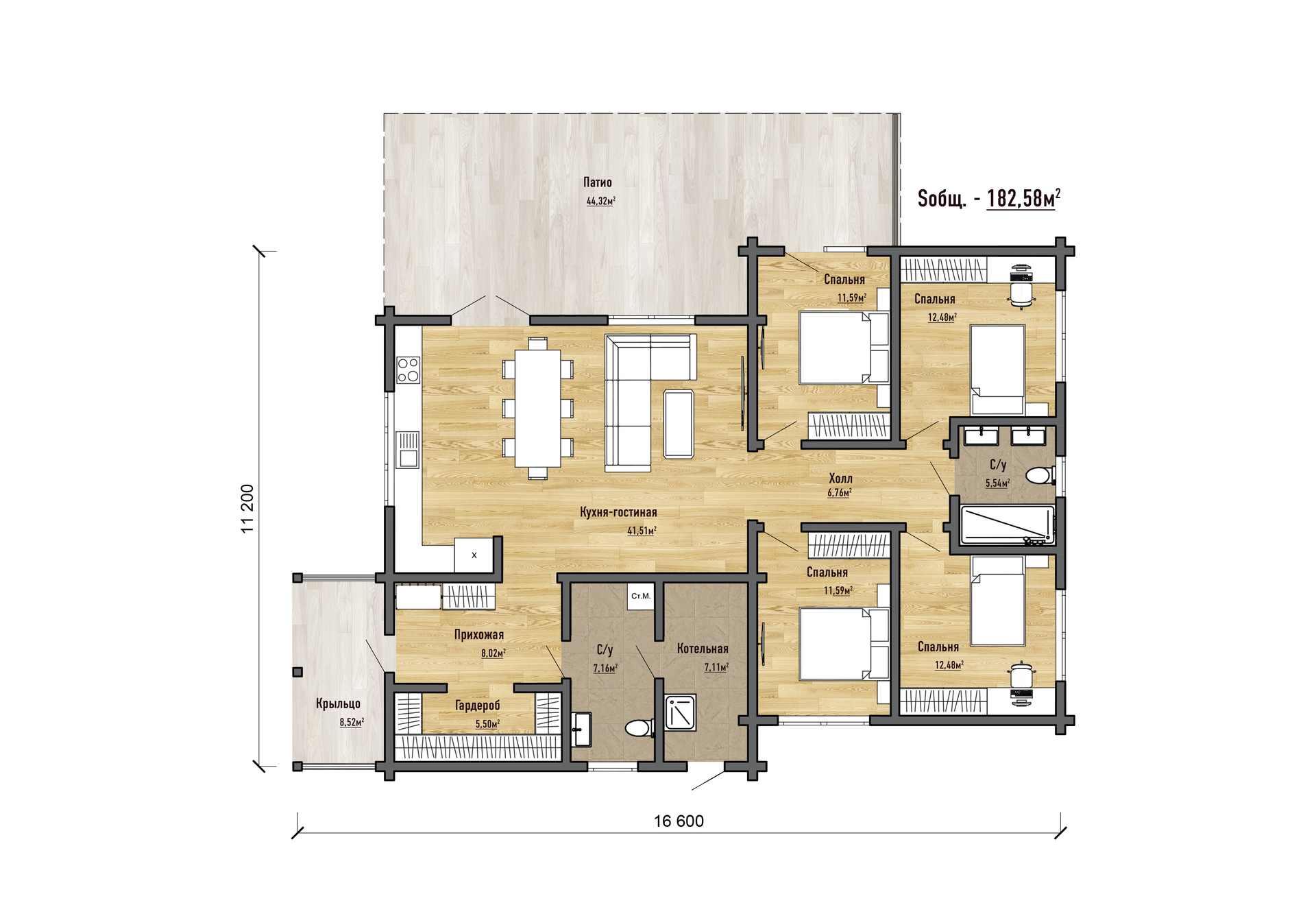 Площадь: 182,58 м² — оптимально для семьи из 4–6 человек