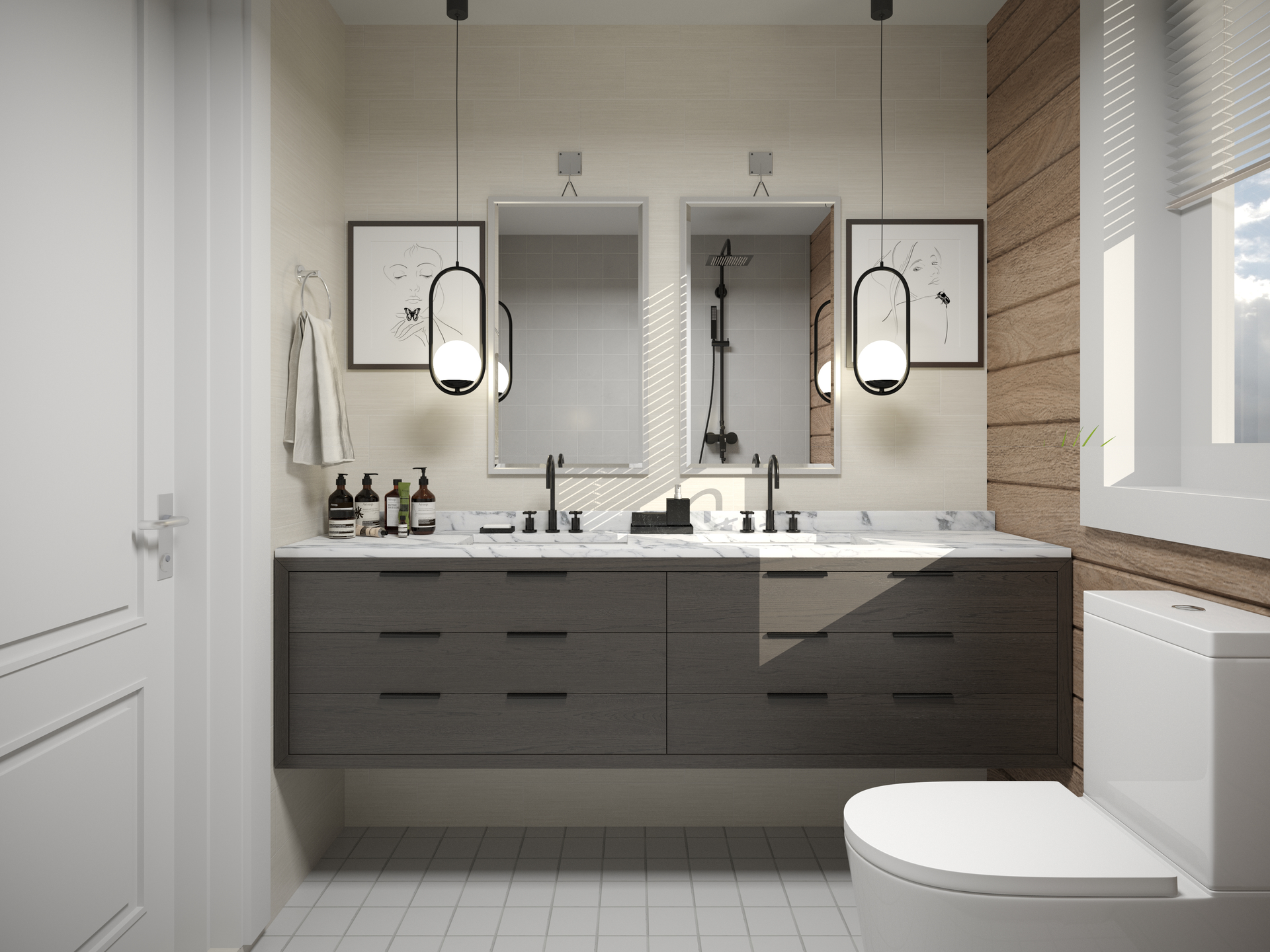 Большой санузел (7,16 м²) со стиральной машиной — для всей семьи. Второй, компактный (5,54 м²), расположен рядом с двумя спальнями — приватный. Два санузла в одноэтажном доме из бруса — не роскошь, а базовый стандарт комфортной жизни.