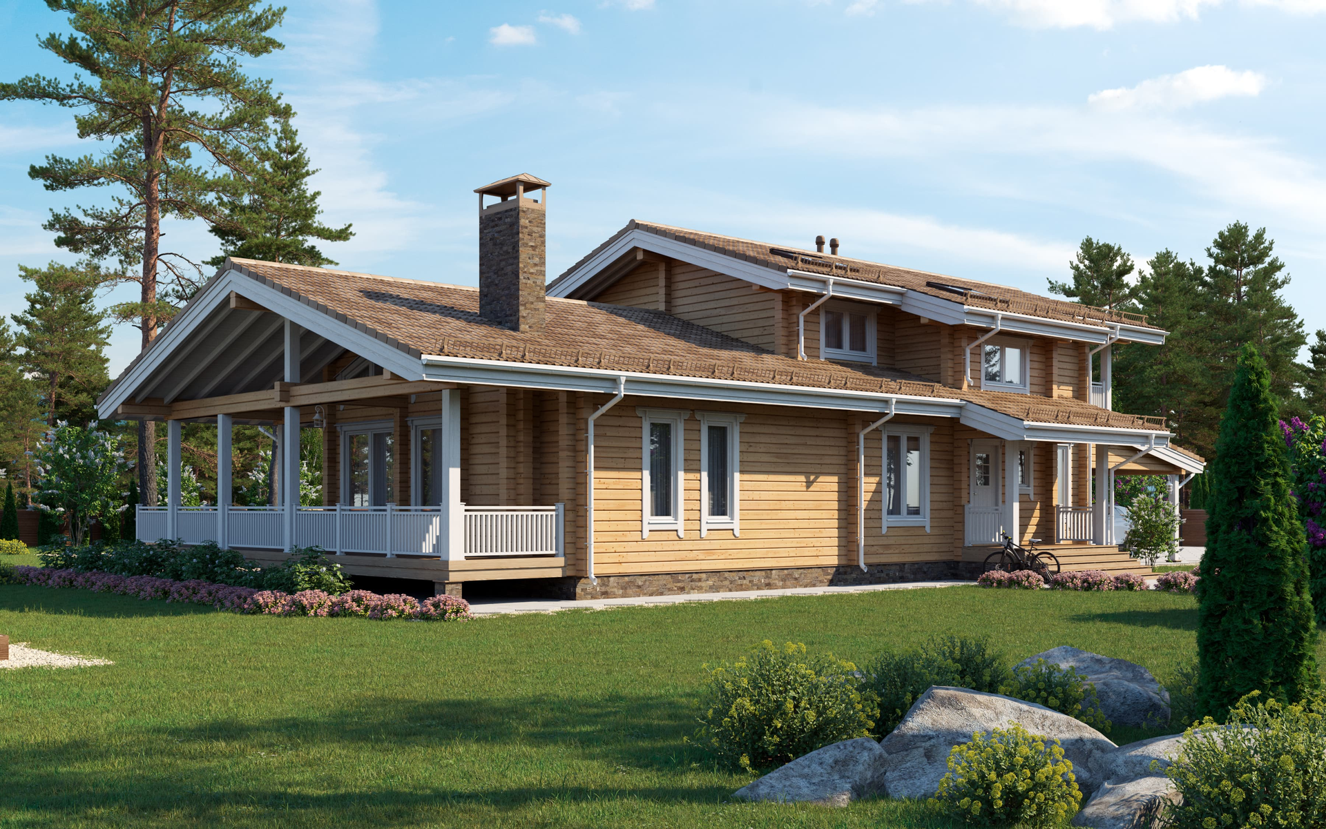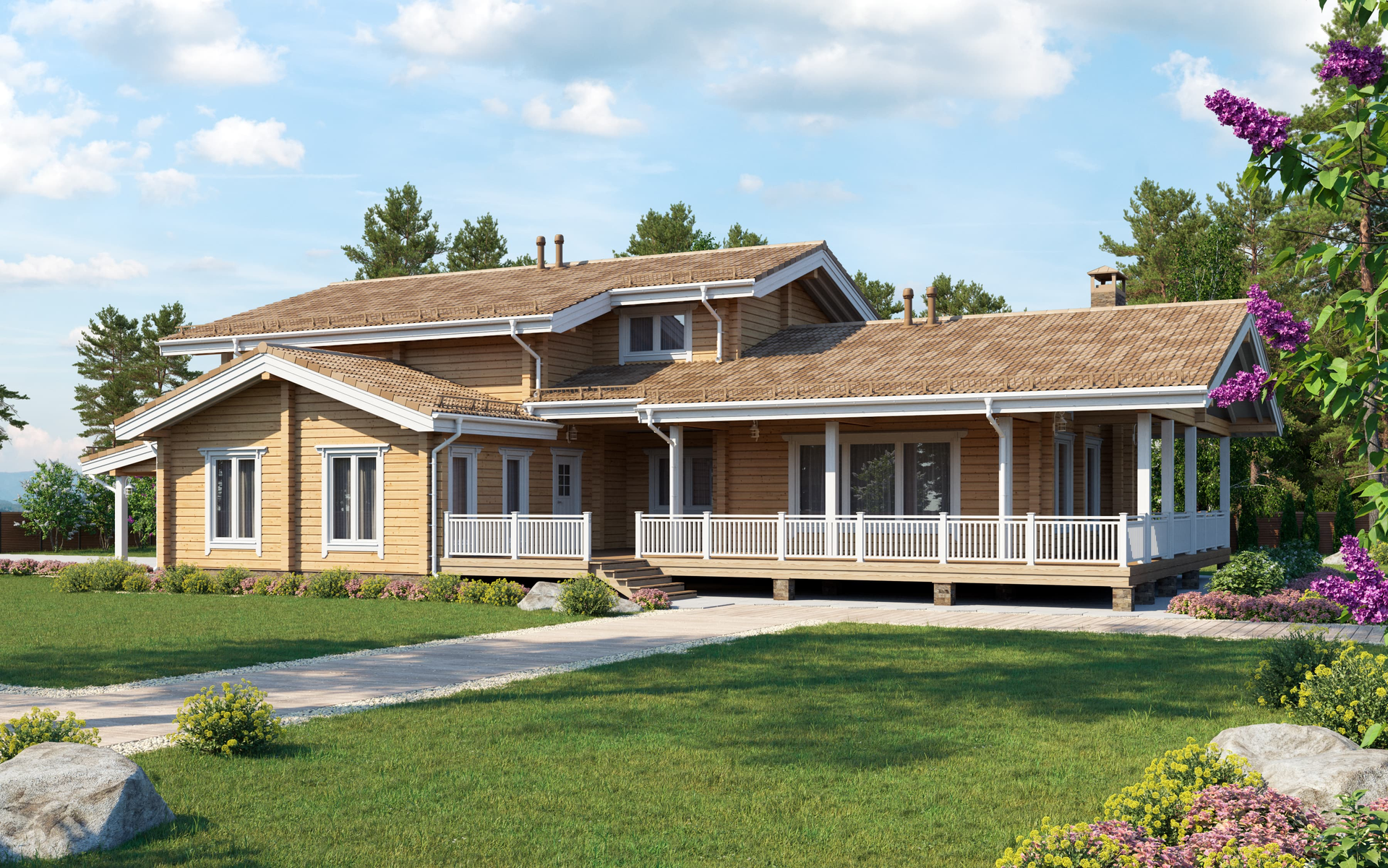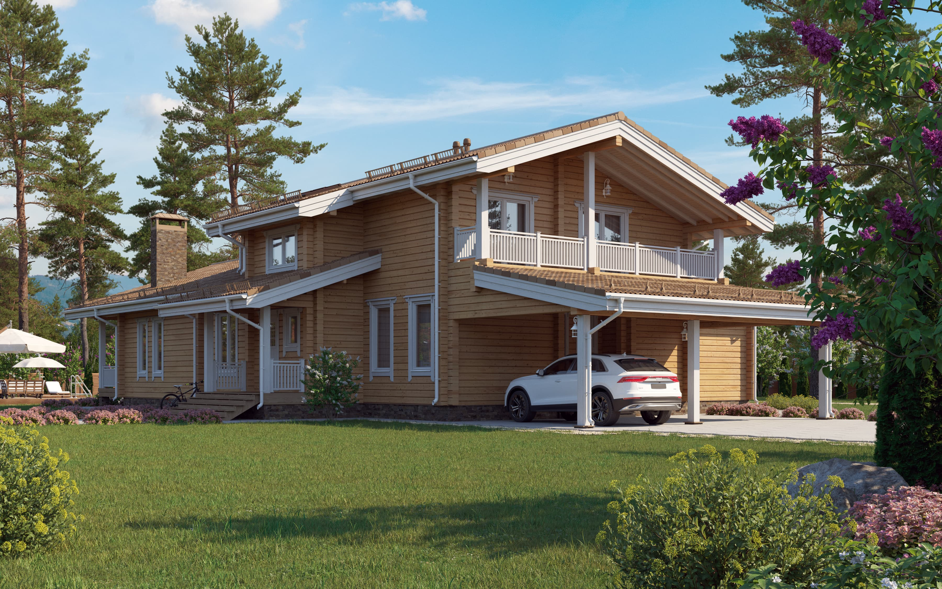 Большой дом для комфортного проживания активной и дружной семьи. Здесь все продумано для мелочей, начиная от уютной планировки жилых помещений до наличия стоянки автостоянки под одной с домом крышей.