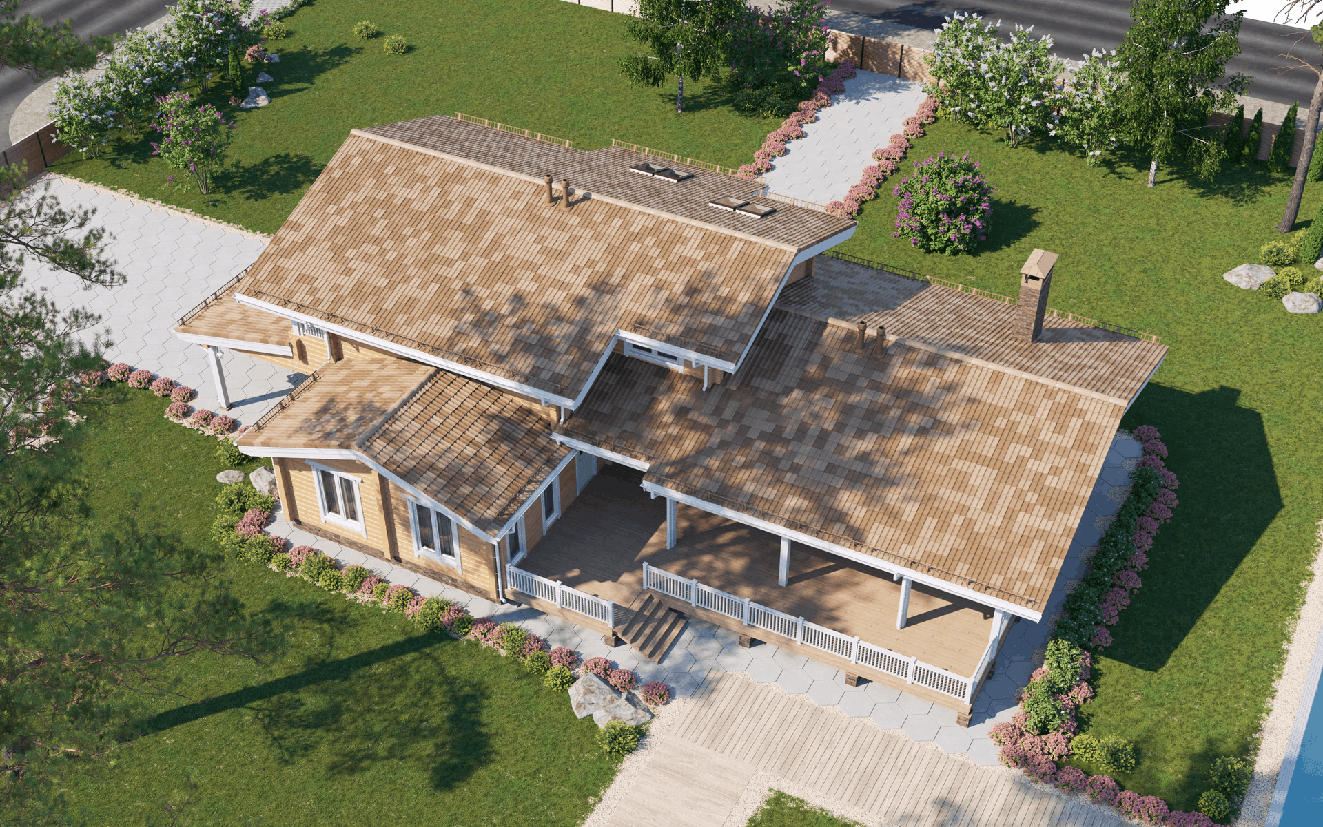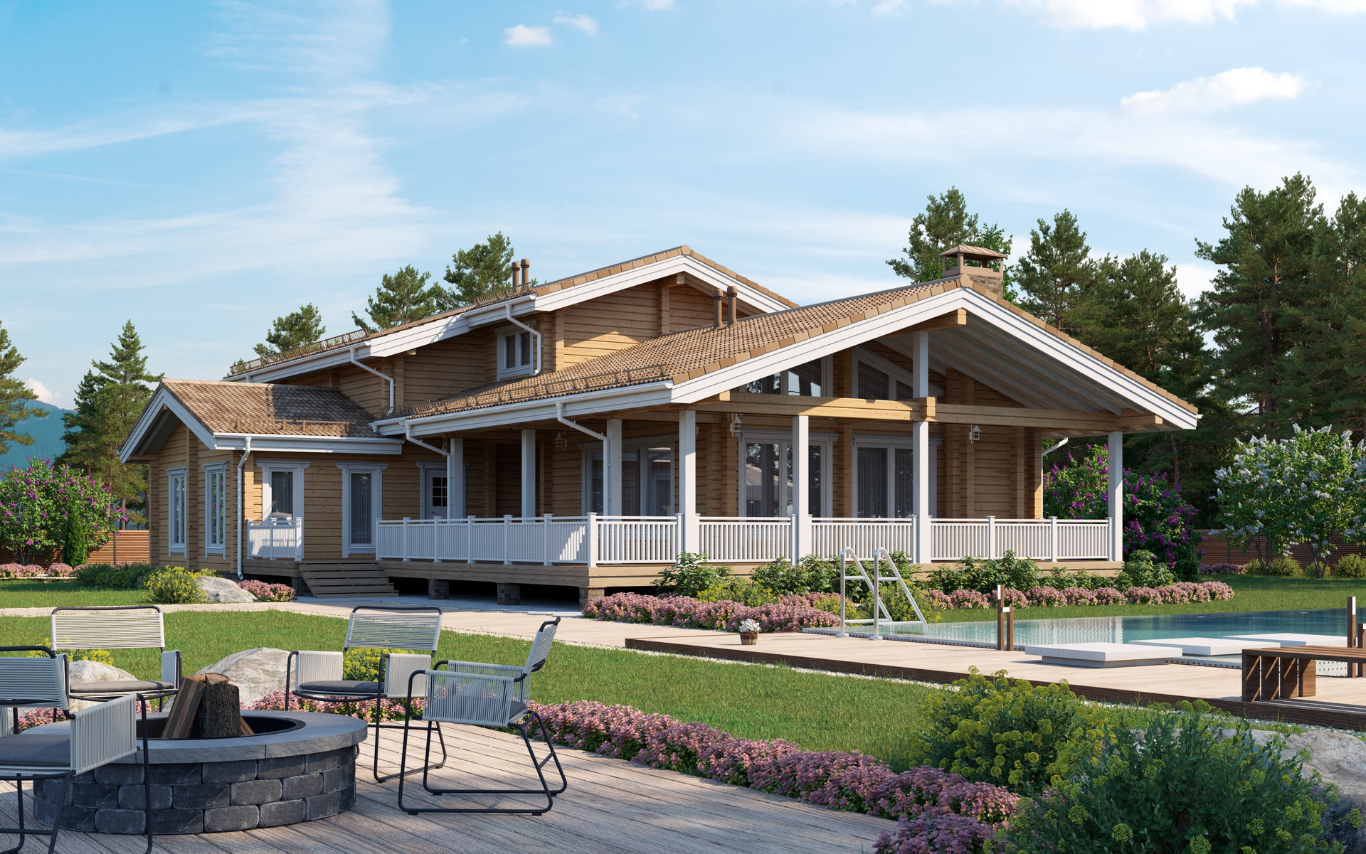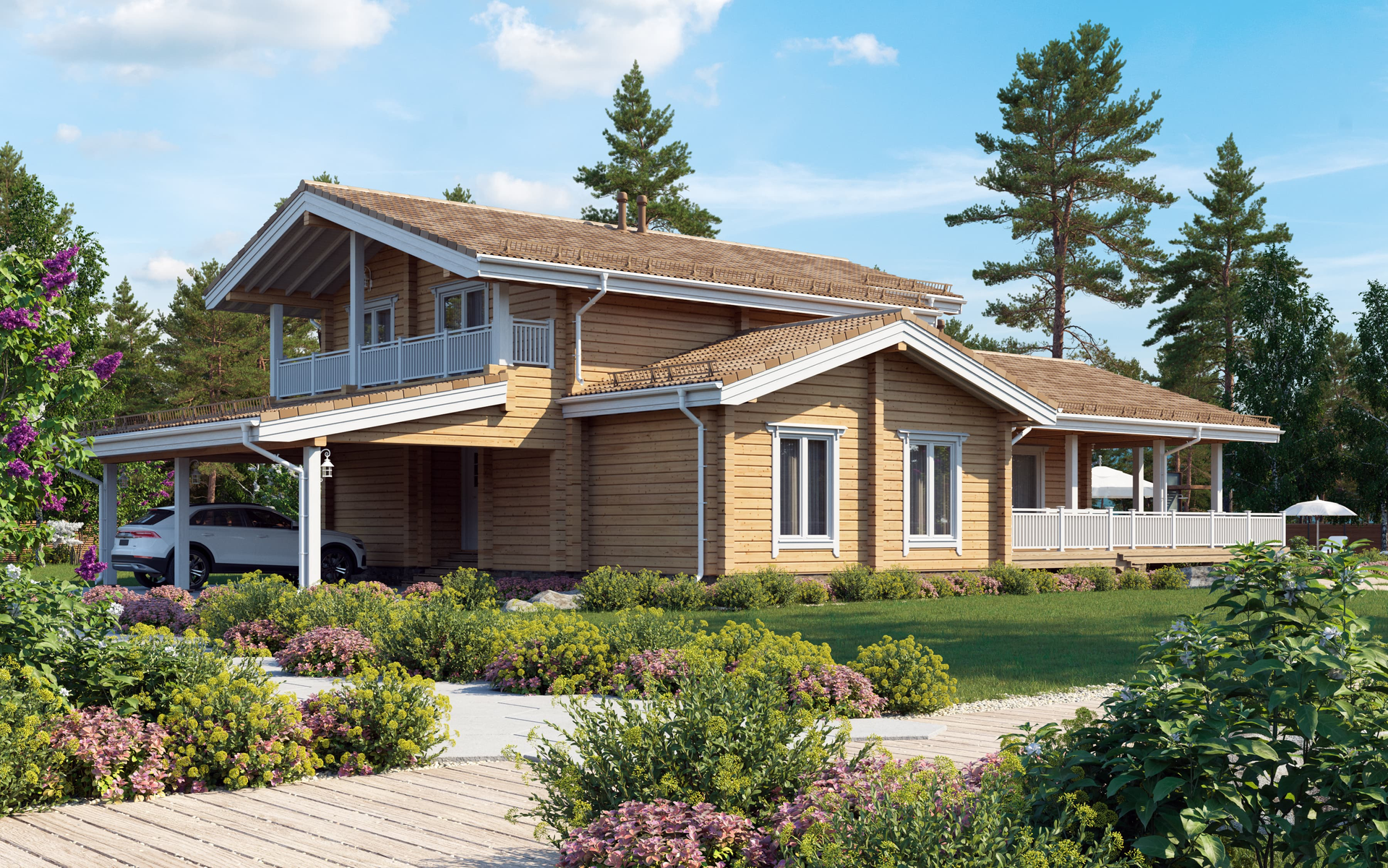 Большой дом для комфортного проживания активной и дружной семьи. Здесь все продумано для мелочей, начиная от уютной планировки жилых помещений до наличия стоянки автостоянки под одной с домом крышей.