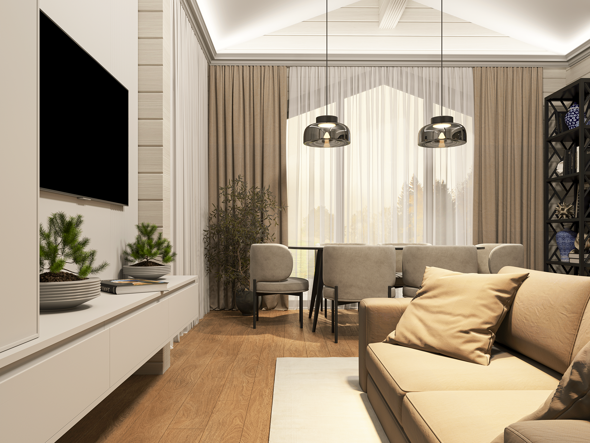 Одноэтажная планировка «Приона» — это современный тренд и удобство «всё под рукой». Каждый метр работает на ваш комфорт. · Сердце дома — гостиная-кухня (41,48 м²): Светлое, свободное пространство с панорамным остеклением. Идеально для семейных вечеров, приёма гостей и уединённого отдыха. Прямой выход на террасу стирает границу между интерьером и природой.