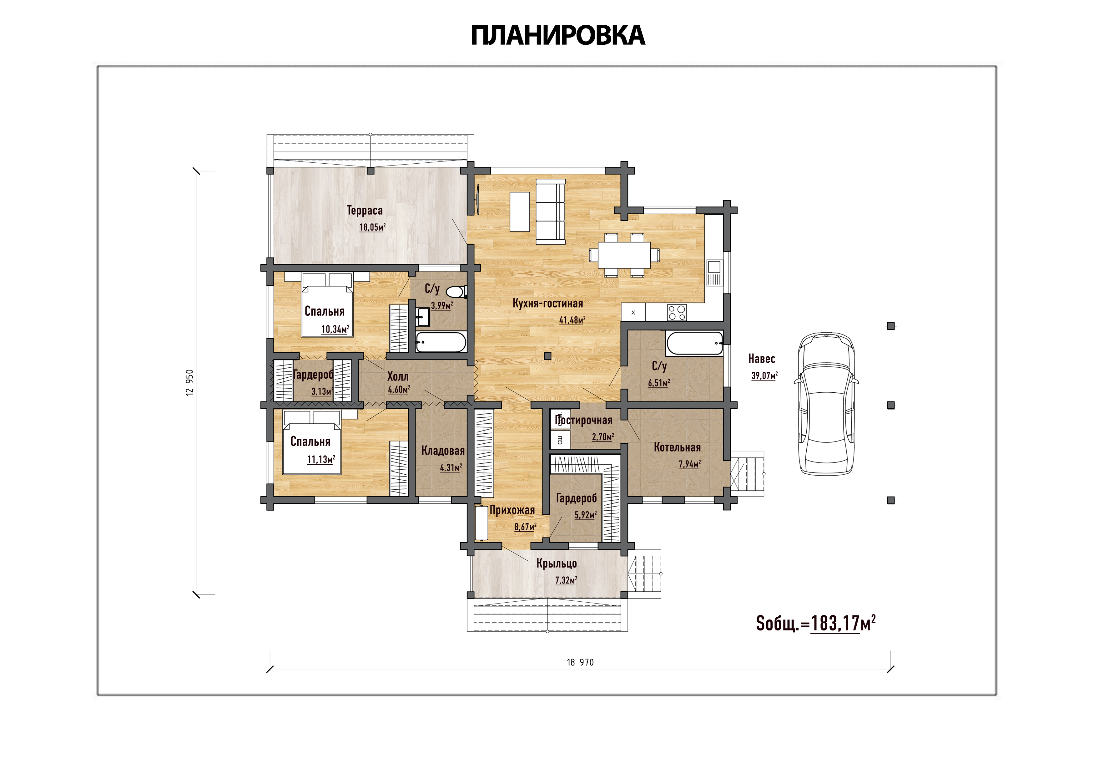 · Профессиональная котельная (7,94 м²) — отдельное безопасное помещение для современного отопительного оборудования, обеспечивающего энергонезависимость и комфорт.