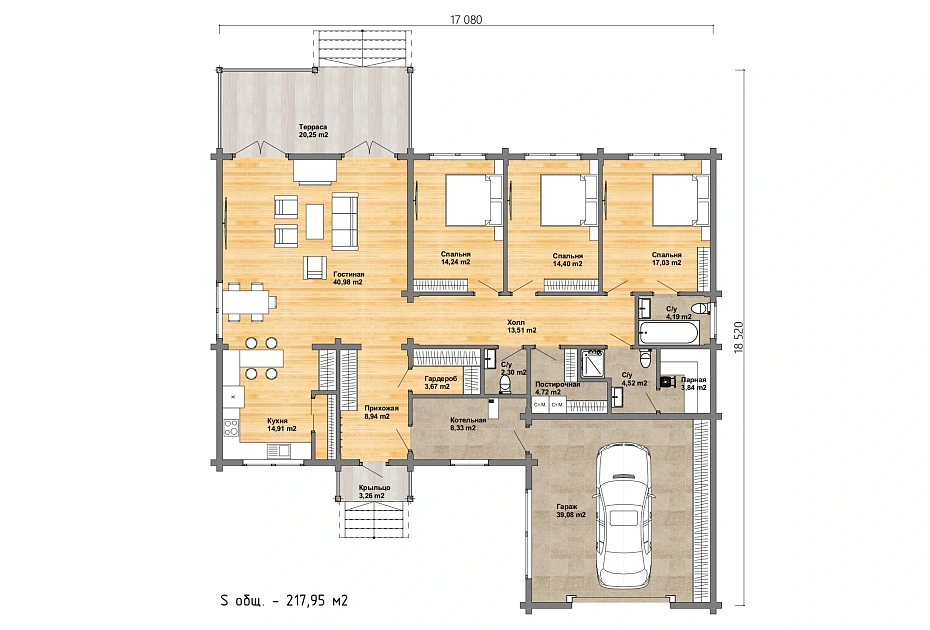 Современный вариант просторного одноэтажного дома для проживания семьи из 5-6 человек. В проекте «Сириус» архитектором учтены эстетические предпочтения и высокие требования к комфортной жизни каждого из нас. Так как все комнаты расположены на одном этаже, дом удобен для проживания членов семьи разного возраста.