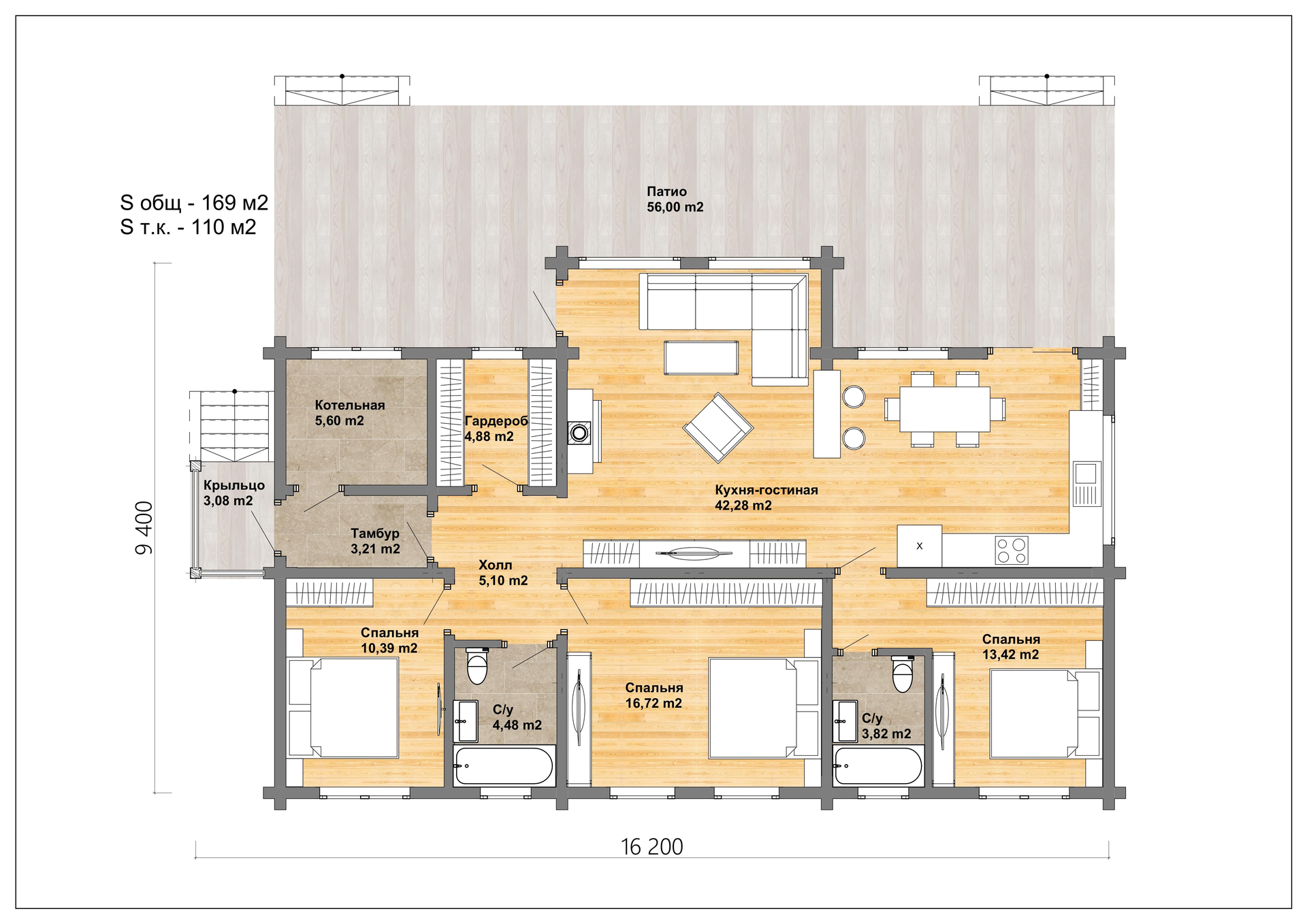 В доме два входа: круглогодичный с крыльца (3,08 кв.м) через тамбур (3,21 кв.м) в холл (5,10 кв.м), второй - летний с патио (56,00 кв.м) в просторную кухню-гостиную (42,28 кв.м).