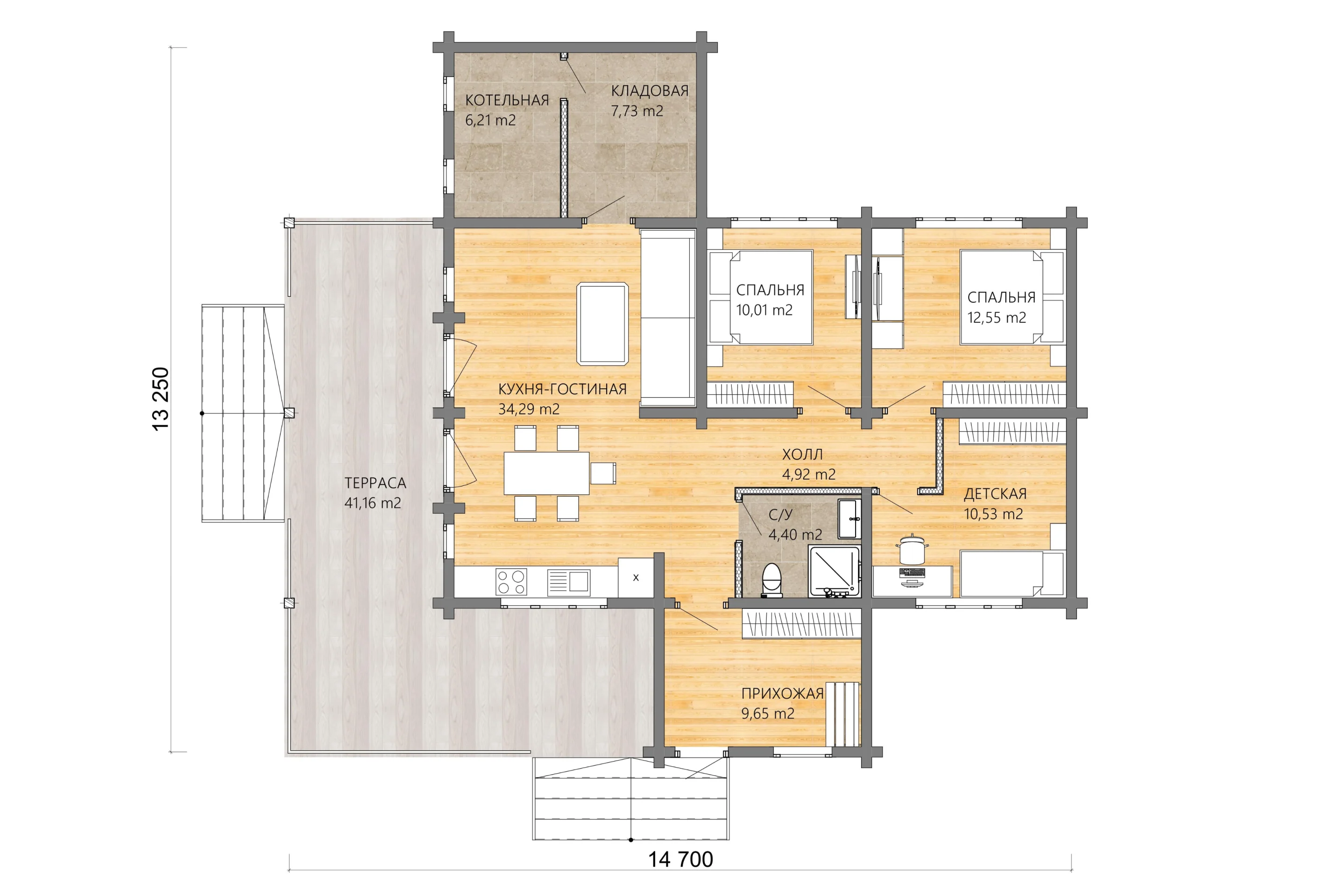 Родительская спальня (12,55 м²) — полноценная комната с местом для двуспальной кровати и гардероба. Вторая спальня (10,01 м²) и детская либо кабинет (10,53 м²) расположены в том же крыле и выходят в общий холл. Дети рядом, но не мешают — именно так работает продуманный проект одноэтажного дома из бруса с 3 спальнями.