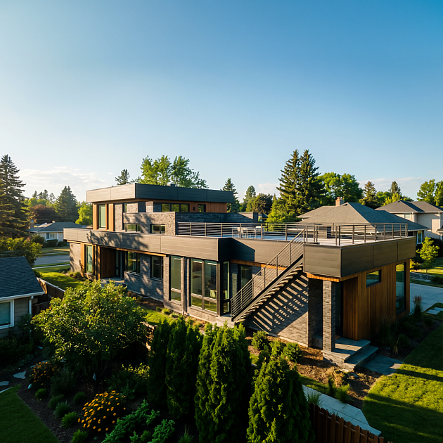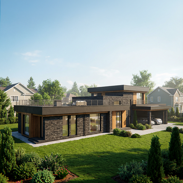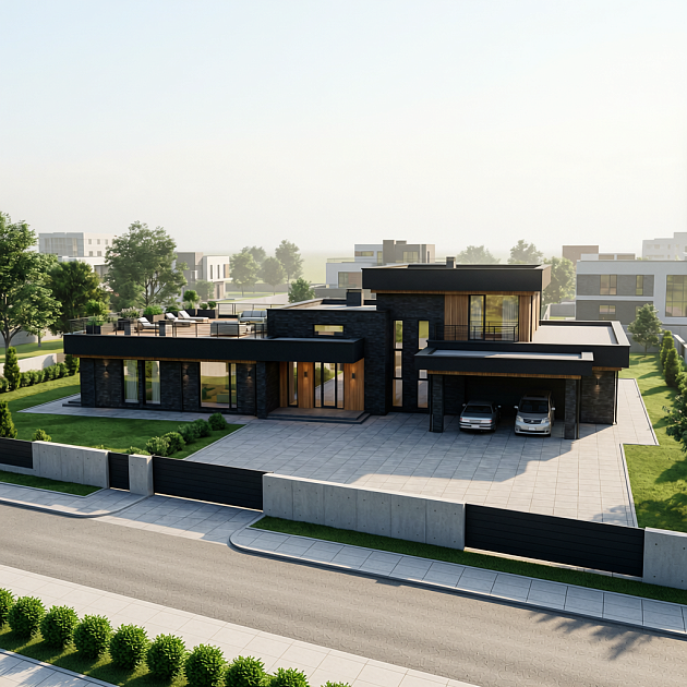 Проект дома «Кларк» — 583 м² Этот проект— воплощение современной архитектуры, где технологичность хай-тека встречается с тёплой текстурой натуральных материалов. Дом из долговечного керамического кирпича с масштабным остеклением. Чёткие линии, функциональная планировка и внимание к деталям создают идеальную среду для требовательного к комфорту владельца. Архитектурные особенности: · Стиль: Чистый, динамичный хай-тек. · Фасад: Смелая комбинация фактур. Надёжный облицовочный кирпич контрастирует с тёплой, обработанной доской. · Концепция: Главный архитектурный приём — большие панорамные окна.