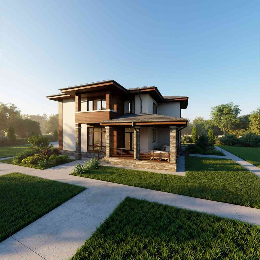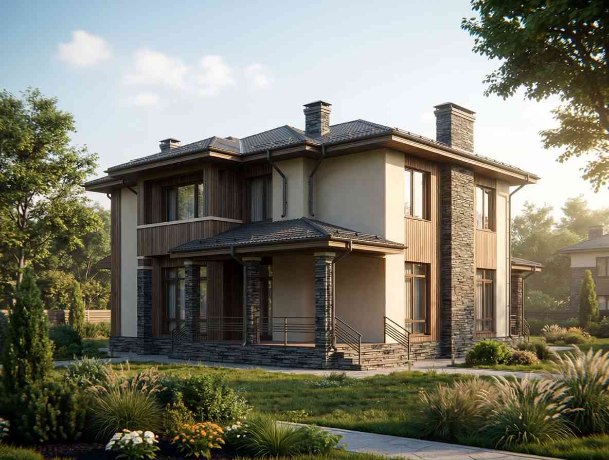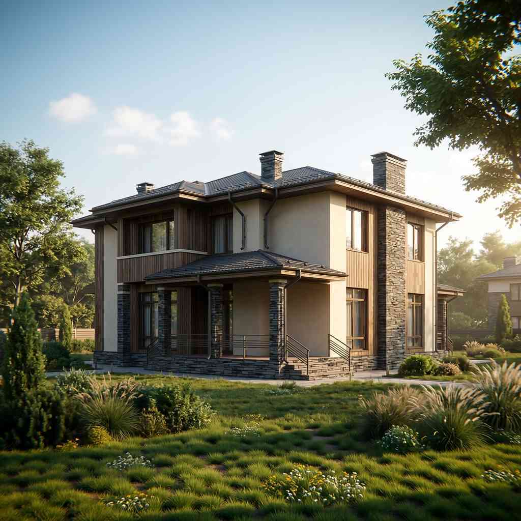 Проект современного двухэтажного дома «РИВЕР» Краткая аннотация: Проект просторного современного дома для большой семьи. Сочетание надежности газобетона, стильного комбинированного фасада и тщательно продуманной планировки с выделенной приватной зоной на втором этаже и светлой гостиной с выходом на террасу. Архитектура и конструкция · Стиль: Современная архитектура с теплыми акцентами. · Конструктив: Надежные и теплые стены из газобетона, скатная крыша. · Фасад: Элегантное и динамичное сочетание камня, гладкой штукатурки светлых тонов и фактурной обработанной доски (например, термодревесины или планкена).