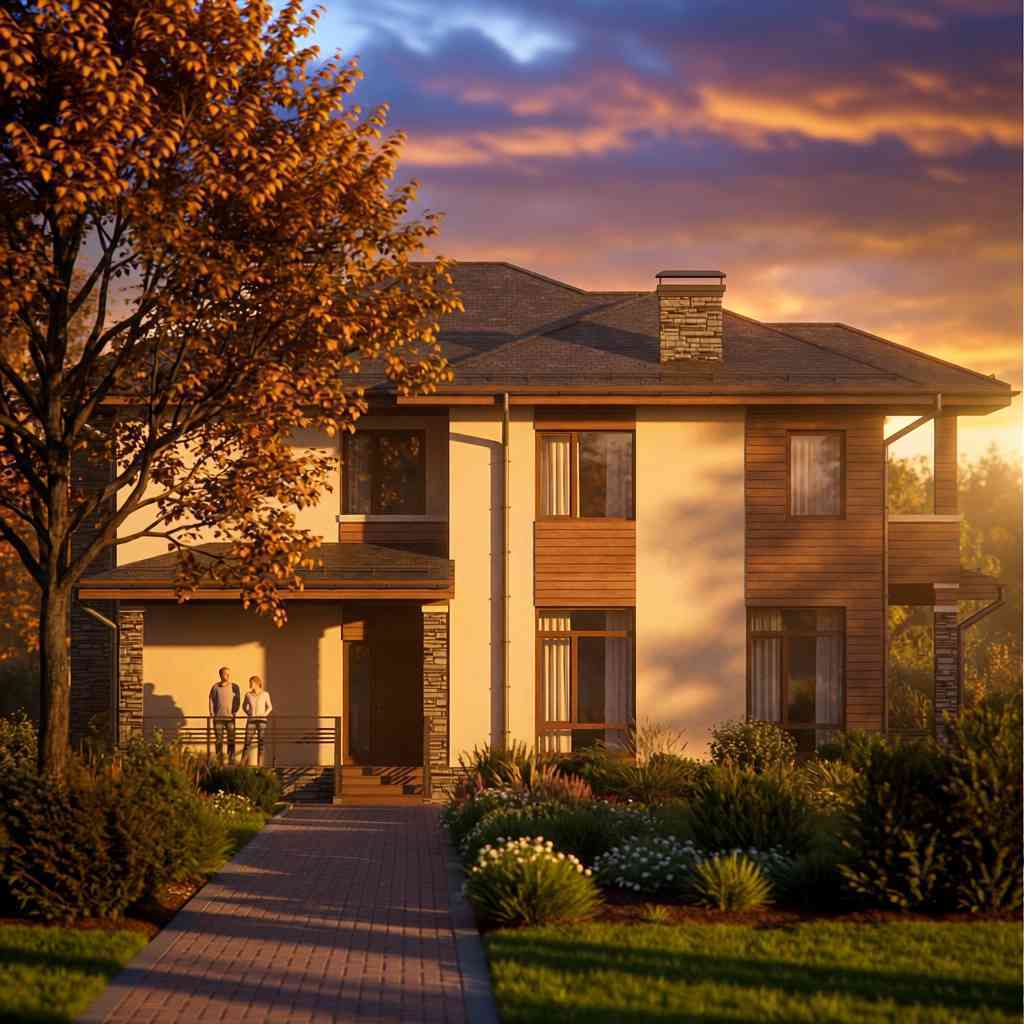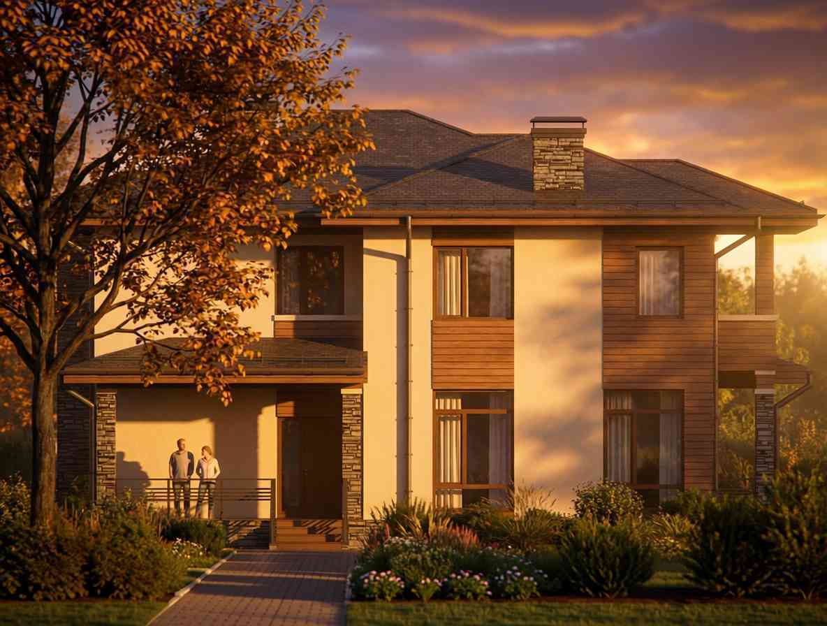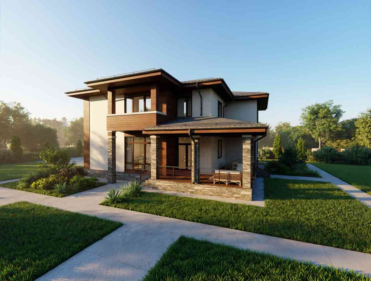 Проект современного двухэтажного дома «РИВЕР» Краткая аннотация: Проект просторного современного дома для большой семьи. Сочетание надежности газобетона, стильного комбинированного фасада и тщательно продуманной планировки с выделенной приватной зоной на втором этаже и светлой гостиной с выходом на террасу. Архитектура и конструкция · Стиль: Современная архитектура с теплыми акцентами. · Конструктив: Надежные и теплые стены из газобетона, скатная крыша. · Фасад: Элегантное и динамичное сочетание камня, гладкой штукатурки светлых тонов и фактурной обработанной доски (например, термодревесины или планкена).
